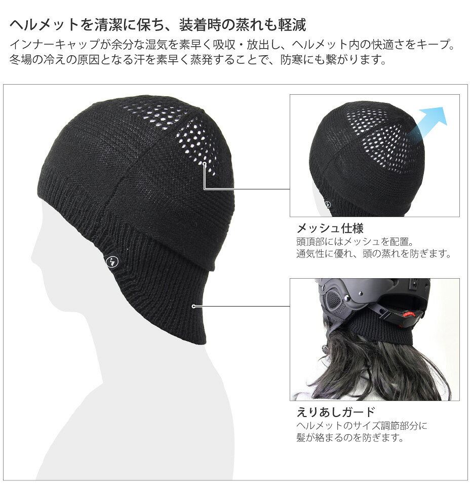 ヘルメットインナー は ヘルメット の下にかぶる メッシュ のインナーキャップ 余分な汗や湿気を吸い取り、メッシュ部分から熱を逃がし、頭を蒸れにくくしてくれます。 【型番】VA-3180 【JANコード】4548766186157 【特徴】 ・メッシュ仕様 ・えりあしカバー 【説明】 ヘルメットの下にかぶるインナーキャップ。 汗の多い頭頂部付近はメッシュ仕様になっており、頭から発する熱を逃がします。 また、前よりも後ろの方が長い作りになっており、ヘルメットのサイズ調節箇所に髪の毛が絡まるのを防いでくれます。