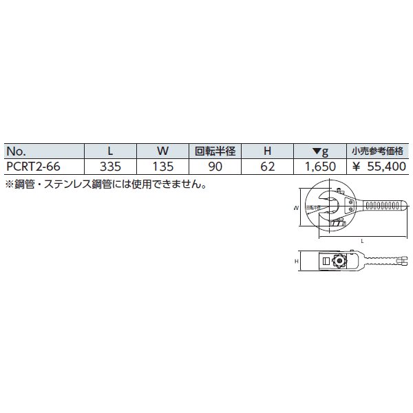 水道用給水から各種配管の切断作業専用工具。各種銅・樹脂配管の切断に使用できます。 ラチェット機構の採用により一定の送り量(力)を保ち無理な力が加わらず、楽に早く切断することができます。 ハンドル振り角度は8°で切断が可能です。狭い場所での切断に威力を発揮します。 本体を回す必要がないので、狭い隙間でもパイプの中心から90mmあれば切断可能です。 カッタは自動的に送られるので最適な切り込みとなり、変形を最小に抑えた切断面に仕上げる事が出来ます。 刃は専用薄刃なので、切断面がきれいです。ボディーはアルミ製で軽く、表面処理は耐摩耗性に優れたクロムメッキ仕上げです。 ※注意事項 出荷前に切断テストをするため、ご購入時にはカッタ(刃)の塗装がはがれています。 鋼管・ステンレス鋼管には使用できません。 カッタ替刃1枚、ノブに内蔵されています。 ■型式:PCRT2-66 ■メーカー:KTC(京都機械工具株式会社) ■全長:335mm ■重量:1650g ■材質:アルミ、スチール ■最大肉厚:銅2.03mm / ポリエチレン:6.5mm ■標準替刃:PCRK-C(銅管・樹脂管用) 人気のカテゴリ 新商品 今月の特価品 オリジナル商品 ワケアリ特価品
