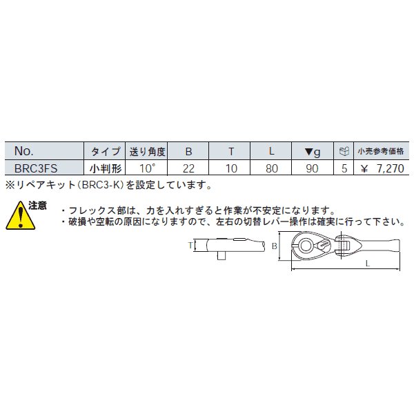 KTC 9.5sq.コンパクトフレックスショートラチェットハンドル。 6.3sq.ラチェットハンドル BR2E と同じヘッド幅、厚みのコンパクトヘッド採用モデル。 小さいヘッドで、9.5sq.ソケットがそのまま使える、バイク修理などに人気のモデルです。 9.5sq.スタンダードタイプラチェットハンドル BR3E (全長180mm)と比べて、100mm短くなっ ているボディーは、手の平のなかにすっぽり収まってしまうコンパクトサイズ。 しっくりくるかたさの首振り機構は、無駄に動きすぎず使いやすく設計されています。 ■型式:BRC3FS ■メーカー:KTC ■全長:80mm ■重量:90g [検索キーワード] KTC-9.5RA 人気のカテゴリ 新商品 今月の特価品 オリジナル商品 ワケアリ特価品