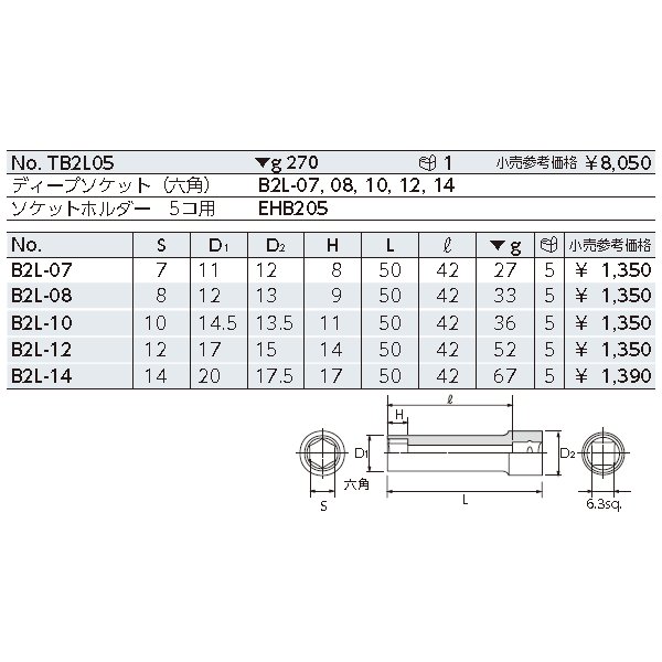狭い箇所で威力を発揮する6.3sq.シリーズ。 自動車内装脱着作業や、オーディオの取り付け、バイクメンテナンスに最適です! 6.3sq.ディープソケット(六角)5点セットです。ホルダー付きなので、そのまま工具箱に入れて頂いても バラバラにならず整理できます。 ■型式:TB2L05 ■メーカー:KTC ■差込角:6.3sq.(1/4) ■セット内容一覧:B2L-07/B2L-08/B2L-10/B2L-12/B2L-14/EHB205 人気のカテゴリ 新商品 今月の特価品 オリジナル商品 ワケあり特価品