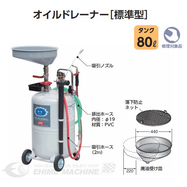 ※商品代引き不可 ※日時指定不可 ※買い合わせ不可 となります。 上記にてご注文いただいた場合、キャンセルさせていただく場合がございますので、 予めご了承ください。 その場合のキャンペーンポイント、クーポン等への保証等は不可 ご注文の流れ、注意事項の画像を必ずご確認ください ※ご注文いただいた時点でご同意済みとさせていただきます [標準型]上抜き下抜き両方に対応したお買得モデル! ・全高を抑え、1BOXタイプのリフトアップ時も安心。 ・ストレートハンドルの採用で省スペースに収納。 ・上抜きであれば、ボンネット内のほかの作業(バッテリーチェック等)とも同時並行で進められ、効率的に行えます。 ■型式:GOD80E ■メーカー:KTC ■タンク:80L ■廃油受皿全容量:12L ■キャスター径:前方(固定)150mm/後方(自在)80mm ■入力用エアカプラ:日東工器20PM ■排出ホース:19mm-2m ■エア加圧式廃油排出 ■重量:29kg 人気のカテゴリ 新商品 今月の特価品 オリジナル商品 ワケアリ特価品
