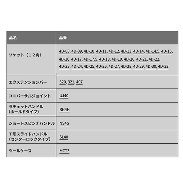 メタルケースと頑丈な梨地トレー、グッドデザイン賞を受賞した「次世代工具シリーズ」のハンドルを採用しています。 産業機械、自動車などの整備に必要な工具を厳選したセットです。 用途:産業機械、自動車などあらゆる分野での組み立て・整備に。 【仕様】 差込角(mm):12.7 セット内容(点):33 ソケット内容(mm):8、9、10、11、12、13、14、14.5、15、16、17、17.5、18、19、20、21、22、23、24、25、26、27、28、29、30、32 ソケット内容:8?32mm ハンドル内容:ラチェットハンドルホールドタイプ(RH4H)、ショートスピンナハンドル(NS4)、T形スライドハンドル(SL40)、エクステンションバー(320:75mm、321:150mm、407:250mm)、ユニバーサルジョイント(UJ40) 対辺形状:12角 質量:6kg メーカー名:TONE(トネ) メーカー品番:170M 商品名:TONE ソケットレンチセット 差込角12.7mm 33点セット JANコード:4953488091731 【ブランド紹介】 TONE(トネ) 1938年創業、1941年に「TONE」ブランドが誕生。ラチェットやトルクツールなどで業界に確かな地位を確立。日本品質の堅牢性と信頼性は国境を越え、世界各国の現場でも選ばれるブランドへと成長した。 人気のカテゴリ 新商品 今月の特価品 オリジナル商品 ワケアリ特価品
