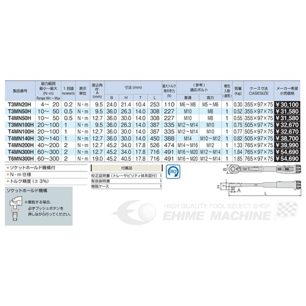 作業時にソケットが外れて落ちにくく、交換時にはワンプッシュ操作でソケットの着脱ができます。 用途:高所においてトルク管理を必要とする箇所での組み立て・整備点検に。 【仕様】 トルク調整範囲(N・m):4~20 最小目盛(N・m):0.2 全長(mm):253 差込角(mm):9.5 頭部幅(mm):24 トルク精度:±3% 負荷方向:右 校正証明書付 質量:0.3kg 【セット内容/付属品】 ケース メーカー名:TONE(トネ) メーカー品番:T3MN20H 商品名:TONE プレセット形トルクレンチ(ダイレクトセット・ホールドタイプ) トルク調整範囲4~20N・m JANコード:4953488208894 【ブランド紹介】 TONE(トネ) 1938年創業、1941年に「TONE」ブランドが誕生。ラチェットやトルクツールなどで業界に確かな地位を確立。日本品質の堅牢性と信頼性は国境を越え、世界各国の現場でも選ばれるブランドへと成長した。 人気のカテゴリ 新商品 今月の特価品 オリジナル商品 ワケアリ特価品