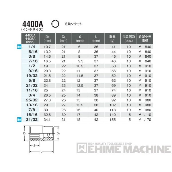 コーケン 4400A-1 インチサイズ 12.7sq. ソケット(六角) Ko-ken 工具 山下工業研究所