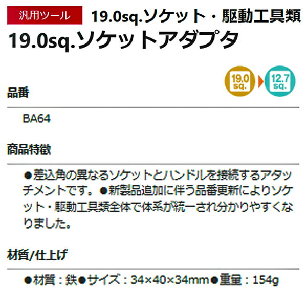 KTC 19.0sq. ソケットアダプタ サイズ変換アダプタ 凹19.0sq.凸12.7sq. BA64 工具 京都機械工具