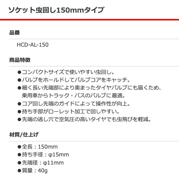 ソケット虫回し150mmタイプ 商品特徴 ●コンパクトサイズで使いやすい虫回し。 ●バルブをホールドしてバルブコアをキャッチ。 ●細く長い先端部により奥まったタイヤバルブにも届くため、乗用車からトラック・バスのバルブに最適。 ●コア回し先端のガイドによって操作性が向上。 ●持ち手部がローレット加工で回しやすい。 ●先端の逃し穴で空気圧の高いタイヤでも虫飛びを軽減。 品番 HCD-AL-150 材質/仕上げ ●全長:150mm ●持ち手径:φ15mm ●先端径:φ11mm ●質量:40g 人気のカテゴリ 新商品 今月の特価品 オリジナル商品 ワケアリ特価品