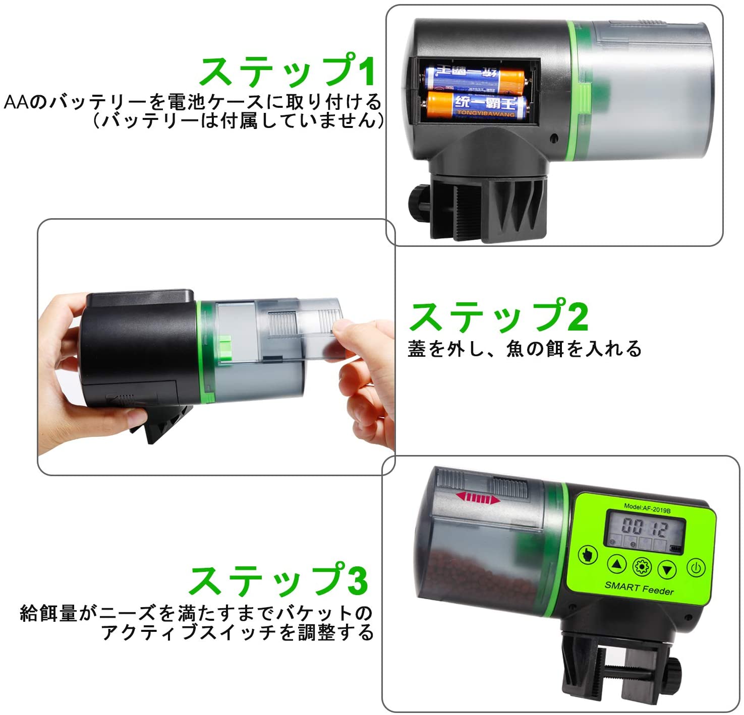 ●商品説明 🐟【自動餌やり機】この魚自動給餌器はデジタルシステム制御、時間設定機能、液晶モニター表示、配線不要。注:充電式電池は使用しないで下さい。給餌量は一日中に4段階を設定でき、各段階には1-3回の餌を投入できます。給餌時間の設定が自由に変更できます。また、手動で餌を与え、餌の楽しさを体験することができます! 🐠【配給量調整可能】エサケースでの調節スイッチを利用して、回転ごとに分配されるエサの配給量が調整できます。給餌量は実際に合わせて魚やペットの数に応じて量を配分する調整可能。魚自動給餌器はお客様が不在時でも自動的に餌を与えることができるので、旅行や出張時も安心なので、大切なお魚やペットの餌やりはおまかせ! 🐳【高い実用性】このフィーダーは2本のAA電池だけで3-6か月間動作できます。従来のプラグ式電源より安全です。200mlのエサケースはフレークタイプ、パウダータイプやストリップタイプ等の餌に適しています。水槽と水族館に適用し、魚イモリカエル様々な魚類に満足できます。それに、回転時に音も気にならないほど静かで、お昼寝にもピッタリ! 🐢【2つの取り付け方】設置もとても簡単です。水槽の様式によって、自動餌やり機の取り付け方が2つあります。水槽のフチにクランプで固定すれば簡単に設置可能。あるいは固定シールで据え置けます。注意:エサケースの餌を乾いた状態に保つために、フィーダーが水位を超えていることを確認してください。 🛒【購入保証】お客様の手に入れるもの:魚自動給餌器本体*1、固定用シール*1、取扱説明書*1。▼ご購入日から、一年間の品質保証サービスを提供します。お使用中に商品自体の品質問題で不具合等がございましたら、いつでもメールでお気軽にお問い合わせ下さい。 ※本商品には「中国語・英語」の取扱説明書が同梱されています。 日本語の説明書(電子版[PDF形式])をご希望の方は、ご注文後にお気軽に「お問い合わせ」ください。 確認後、楽天のメッセージにてお送りさせていただきます。