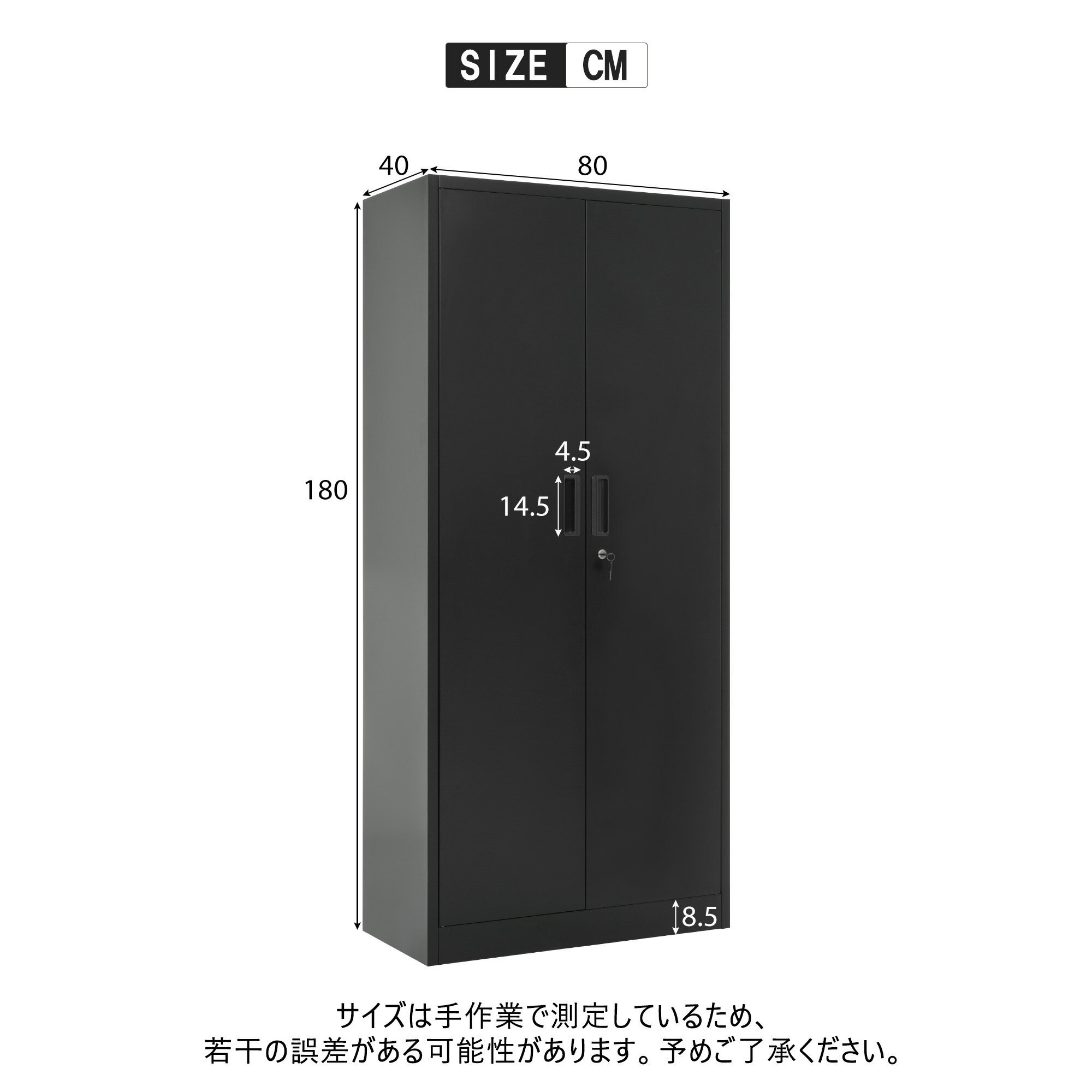 【頑丈なスチール製】 高品質なスチール製で、耐久性と強度に優れ、大切な本や資料をしっかりと守ります。 【高品質なコーティング】水拭きや乾拭きで簡単に清掃可能で、キズや汚れがつきにくく、長期間美しさを保ちます。 【収納力抜群】 幅80cm、高さ180cmの広い開口部でたっぷり収納でき、棚板は自由に調節可能です。 【安心保管】鍵をかけられる設計なので、セキュリティが必要な大切な書類や貴重品をしっかり守れます。オフィスやご家庭でも安心して収納でき、プライバシーと安全性を確保します。 【多用途に対応】オフィス、病院、学校など、どんな場所でも適用可能で、中身が見えない扉で信頼性抜群です。商品情報カラーブラック商品サイズ180*80*40cm梱包サイズ185.8*45.8*14.1cm梱包重量(Gross weight)30.8kg