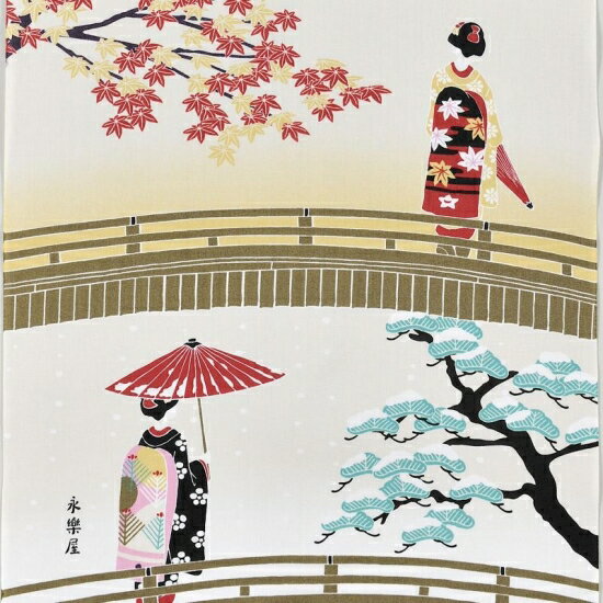 春の桜、夏の柳、秋の紅葉、冬の松雪。季節の移ろいを感じながら橋を渡る舞妓さんを描いた作品です。 四季に合わせ、帯などの模様も変えております。 サイズ:約91×36cm 素 材:綿 100% ※モニターの発色の具合により実際の商品と色が異なる場合がございます。〜永楽屋の手ぬぐいについて〜 「永楽屋の手ぬぐい」はオリジナルの木綿生地を使っています。ケバの少ない上質な糸を昔ながらの織機を使って、国内で時間をかけて丁寧に織っています。織りあがった生地はきめが細かくなめらかな肌触りです。 永楽屋の手ぬぐいは主に、日本の代表的染技法のひとつである、友禅染で染めています。図案をもとに色の数だけ型を作り、一枚一枚丁寧に色を重ねていきます。発色が鮮やかで美しく、手拭の存在感を引き立たせています。 〜手ぬぐいのお手入れについて〜 手ぬぐいは江戸の昔より小巾木綿で作られていて、長さ方向は様々な用途に対応するため、切りっぱなしになっています。そのため、使用しているうちに横糸が少しずつほつれてきますが、何度かお洗濯いただくと馴染んでまいります。ほつれてきた横糸は無理に引っ張ったりせずに、はさみで余分な糸をカットしてください。 〜お洗濯について〜 洗濯機などのたっぷりの水で洗って下さい。濃い色の商品は色落ちする可能性がございますので、他のものと分けてお洗濯下さい。 長時間の浸け置きや濡れたままの放置、生地が重なった状態で干したりしますと色移りの原因となります。洗濯後はすみやかに形を整えて陰干ししてください。