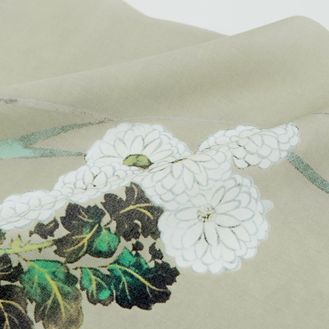 京都吉兆所蔵、江戸琳派の祖・酒井抱一による「菊薄図」。 琳派の装飾性と繊細な写実性が融合し、大胆な構図と菊の花の立体感が印象的な一枚を手ぬぐいに仕上げました。 ※モニターの発色の具合により実際の商品と色が異なる場合がございます。 サイズ:約91×36cm 素 材:綿 100% 京都吉兆×永楽屋 ■京都吉兆について 四季折々の景観が美しい京都、嵐山に本店を構える「京都吉兆」。 創業者、湯木貞一の「世界の名物、日本料理」を信条に、日本の食材にこだわり、厳選した季節の料理、器、空間、サービスなど、五感で味わう日本料理を提供しています。 お客様に合わせた心づくしのおもてなしは、“いつまでも記憶に残るひととき”をお届けしたいと願う、三代目、徳岡邦夫のお客様への思い。また、日本の食文化を世界にも広めるため、国賓へおもてなし、海外でのイベント参加にも積極的に行っています。 京都に3店舗、名古屋にも店舗があり、地域の特性を生かした料理、おもてなしでお客様をお迎えしております。〜永楽屋の手ぬぐいについて〜 「永楽屋の手ぬぐい」はオリジナルの木綿生地を使っています。ケバの少ない上質な糸を昔ながらの織機を使って、国内で時間をかけて丁寧に織っています。織りあがった生地はきめが細かくなめらかな肌触りです。 永楽屋の手ぬぐいは主に、日本の代表的染技法のひとつである、友禅染で染めています。図案をもとに色の数だけ型を作り、一枚一枚丁寧に色を重ねていきます。発色が鮮やかで美しく、手拭の存在感を引き立たせています。 〜手ぬぐいのお手入れについて〜 手ぬぐいは江戸の昔より小巾木綿で作られていて、長さ方向は様々な用途に対応するため、切りっぱなしになっています。そのため、使用しているうちに横糸が少しずつほつれてきますが、何度かお洗濯いただくと馴染んでまいります。ほつれてきた横糸は無理に引っ張ったりせずに、はさみで余分な糸をカットしてください。 〜お洗濯について〜 洗濯機などのたっぷりの水で洗って下さい。濃い色の商品は色落ちする可能性がございますので、他のものと分けてお洗濯下さい。 長時間の浸け置きや濡れたままの放置、生地が重なった状態で干したりしますと色移りの原因となります。洗濯後はすみやかに形を整えて陰干ししてください。