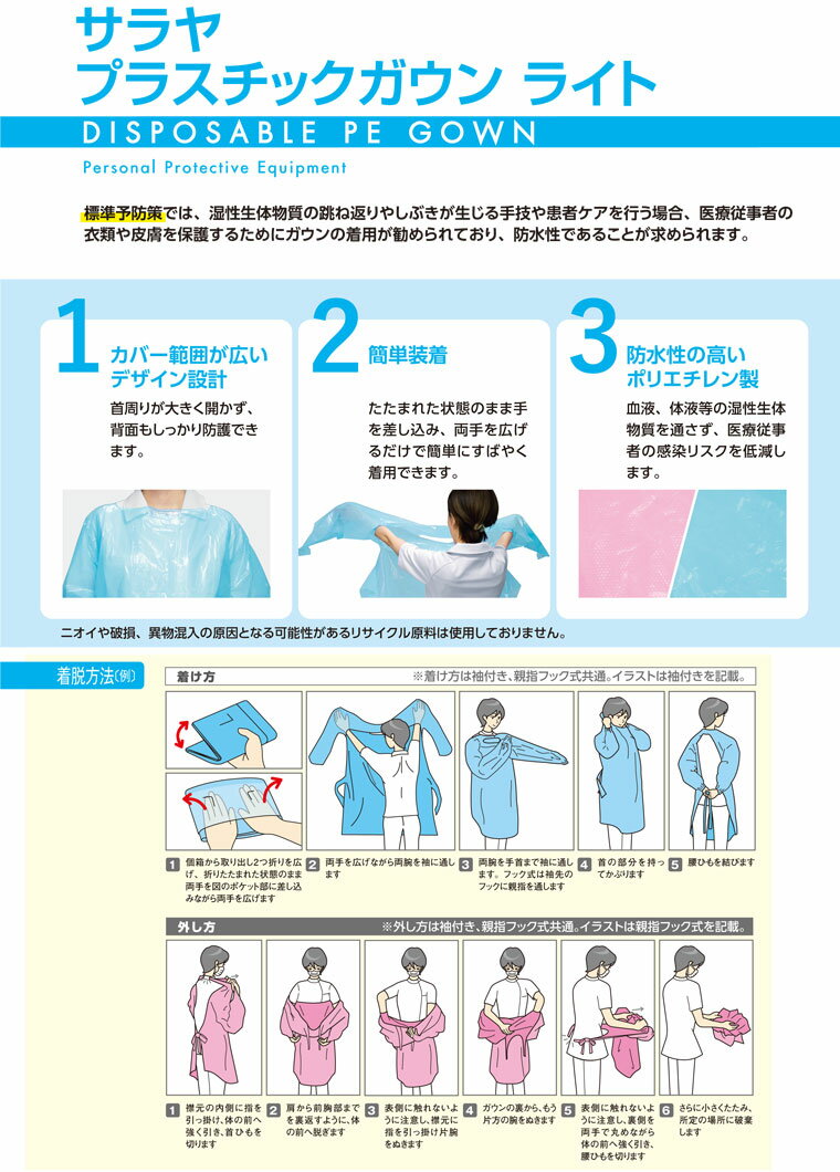 袖口にゴムのない親指フック式です。 標準予防策では、湿性生体物質の跳ね返りやしぶきが生じる 手技や患者ケアを行う場合、医療従事者の衣類や皮膚を保護するために ガウンの着用が勧められており、防水性であることが求められます。 ■特徴 1カバー範囲が広いデザイン設計 首周りが大きく開かず、背面もしっかり防護できます。 2簡単装着 たたまれた状態のまま手を差し込み、両手を 広げるだけで簡単にすばやく着用できます。 3防水性の高いポリエチレン製 血液、体液等の湿性生体物質を通さず、 医療従事者の感染リスクを低減します。 ■主な用途 (1)患者のケア中に、湿性生体物質が、衣類や皮膚に飛散したり 跳ね返る可能性がある場合 ・嘔吐、吐血や喀血のある患者のケア時 ・気管吸引時 ・広範な熱傷や開放創などの処置ケア時 など (2) 湿性生体物質で汚染される可能性のある作業時 ・排吐物、尿や便などの湿性生体物質の処理時 ・医療器材などの洗浄・消毒時 など (3) 接触感染する微生物が検出されている患者への ・濃厚接触時(全身清拭など) (4) 医療従事者の制服のホコリが患者に対して 完全遮断が必要な場合 など ■サイズ:フリーサイズ ■カラー:ブルー ■入り数:30枚入×10箱(300枚) ※1枚/袋の個包装ではございません※ ■材質 :ポリエチレン ■製造元:サラヤ株式会社