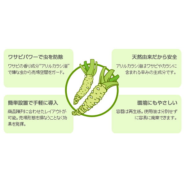 お得な10個セットはこちら有効成分が総菜売場やベーカリー、生鮮食品売場の衛生環境を守り、食品に飛翔昆虫などを寄せつけにくくします。 また、専用ラックに記載された説明文が、来店したお客様に対して、清潔な売り場をアピールします。 ※専用ラック(スタンド)は別売りです。こちらのページで販売しております。 アリルカラシ油は、ワサビやカラシに含まれるツンとくる香り成分です。揮発性であるため空気中に容易に拡散し、飛翔昆虫などの害虫を寄せつけにくくする効果が確認されています。食品添加物としても認められており、人体や食品に影響を与えません。 ※害虫に対する忌避効果実験では、「ワサオーロ・カセット」設置による忌避率が約70%と確認されました。 「ワサオーロ・カセット」は、食品の風味を損なうことなく、害虫の防除対策に効果を発揮します。食品陳列の少し高い位置に設置することで、揮発したアリルカラシ油成分が効果的に空間を包み、害虫を寄せつけにくくします。 1.処理対象空間の上部に吊るす。 2.専用ラック(スタンド)に入れて置く。 ※専用ラック(スタンド)は別売りです。こちらのページで販売しております。 香りの強さはどれくらい? 「ワサオーロ・カセット」は、アルミ袋開封時に強い刺激臭がありますが、1時間ほどで収まります。開放された場所で開封し、刺激臭が収まったら設置してください。香り成分は食品添加物として認可されているもので、人がほとんど感じないかすかな香りで害虫の防除対策効果を発揮します。