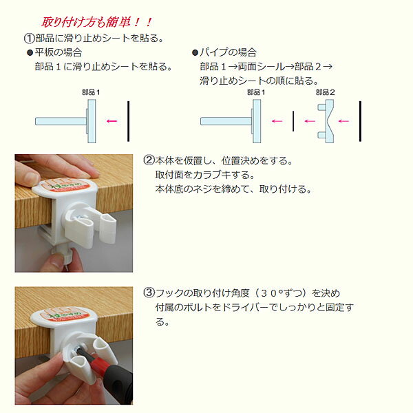 ・固定可能な天板の厚みは13mm〜30mmです。 ・対応する杖の太さは、直径12mm〜直径22mmです。 ・対応するパイプ厚みは直径18mm〜直径27mmです。 ※手をついて体を支えないで下さい。 ※重い物や貴重品はぶら下げないで下さい。 ・平板を挟み込み、ネジで固定するタイプの杖ホルダーです。 ・机や受付カウンターに簡単取付! ・置き場所に困る杖が倒れないように支えます。 ・ネジ止型なので、取り外し可能。 ・フック部は30°ずつ角度が調整できます。 ・机の移動などに対応できます。 ・中は滑り止めシート付 ●推奨杖径/直径12mm〜22mm ●天板厚み/13mm〜30mm ●パイプ厚み/直径18mm〜27mm ●材質/ABS、エラストマー ●カラー/グリーン ピンク ブルー ホワイト ●メーカー品番/tue-NX ●JANコード/ グリーン:4950484002228 ピンク:4950484002235 ブルー:4950484002211 ホワイト:4950484002242 ●メーカー名/サンセイ