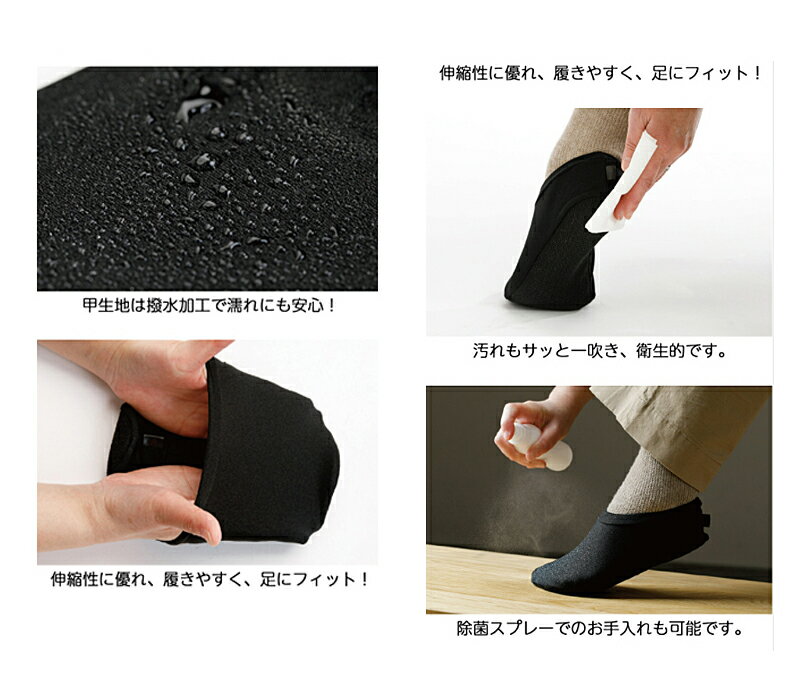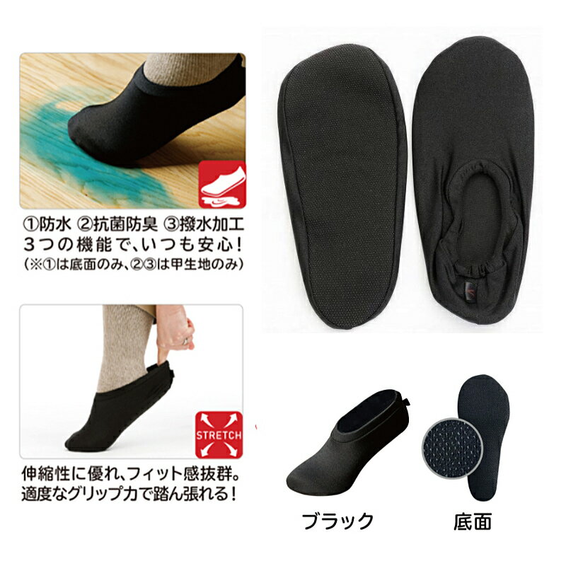 ・履くだけで汚れ対策と感染予防。 ・防水・抗菌防臭・撥水加工、3つの機能でいつも安心! ・伸縮性に優れ、フィット感抜群。 適度なグリップ力で踏ん張れる! ・気になる汚れからあなたを守る! 汚れもサッと一拭き、衛生的です! ●サイズ/ M:22.0〜23.0cm L:23.5〜24.5cm LL:25.0〜26.0cm 3L:26.5〜27.5cm ●重さ/約18g(片足Lサイズ) ●材質/ 表:ナイロン85%・ポリウレタン15% 中底・底材:ポリエステル100% ●生産国/中国 ●洗濯機可(ネット使用) ●防水加工(底面のみ)、撥水加工・抗菌加工・防臭加工(甲生地のみ) ●室内用 ●メーカー品番/4602 ●JANコード/ M:4537944294906 L:4537944295002 LL:4537944295101 3L:4537944295200 ●メーカー名/徳武産業