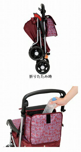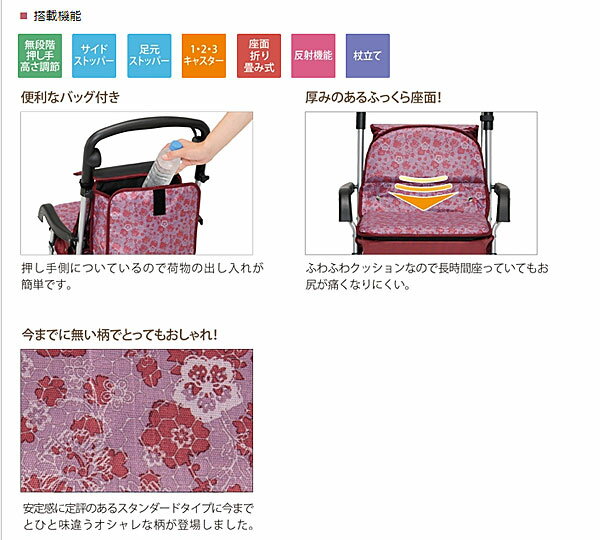 ・ゆったり座れる幅広座面。 ふわふわクッションで優しい座り心地。 お出かけ好きの強い味方。 ・他とかぶらない、一歩先行くこだわりカラー。 ・便利なバッグ付き 押し手側についているので荷物の出し入れが簡単です。 ・柄っとおしゃれにイメージチェンジ 定番のカタチに周りとはひと味ちがう新たな色柄が仲間入り ・スチール塗装仕上げ ●サイズ/ 幅50.5×奥行66×高さ83〜89(無段階)cm 折りたたみ時:奥行25×高さ80cm 座面:幅36.5×奥行30cm 座面高:45cm ●車輪サイズ/前輪17×後輪17cm ●重さ/約6.6kg ●材質/ フレーム:スチール バッグ:ポリエステル ●バッグ容量/約30L、後ポケット:9L ●積載荷重/15kg、後ポケット:0.5kg ●最大使用者体重/100kg ●標準機能/ 折りたたみ(自立不可)、駐車ブレーキ、座面、 手元ブレーキ、3WAYキャスター(360°・左右45°・固定)、 杖・傘立て、反射機能 ●SGマーク取得商品 ●メーカー品番/SIST04-RE ●JANコード/4938765005649 ●メーカー名/幸和製作所