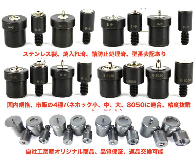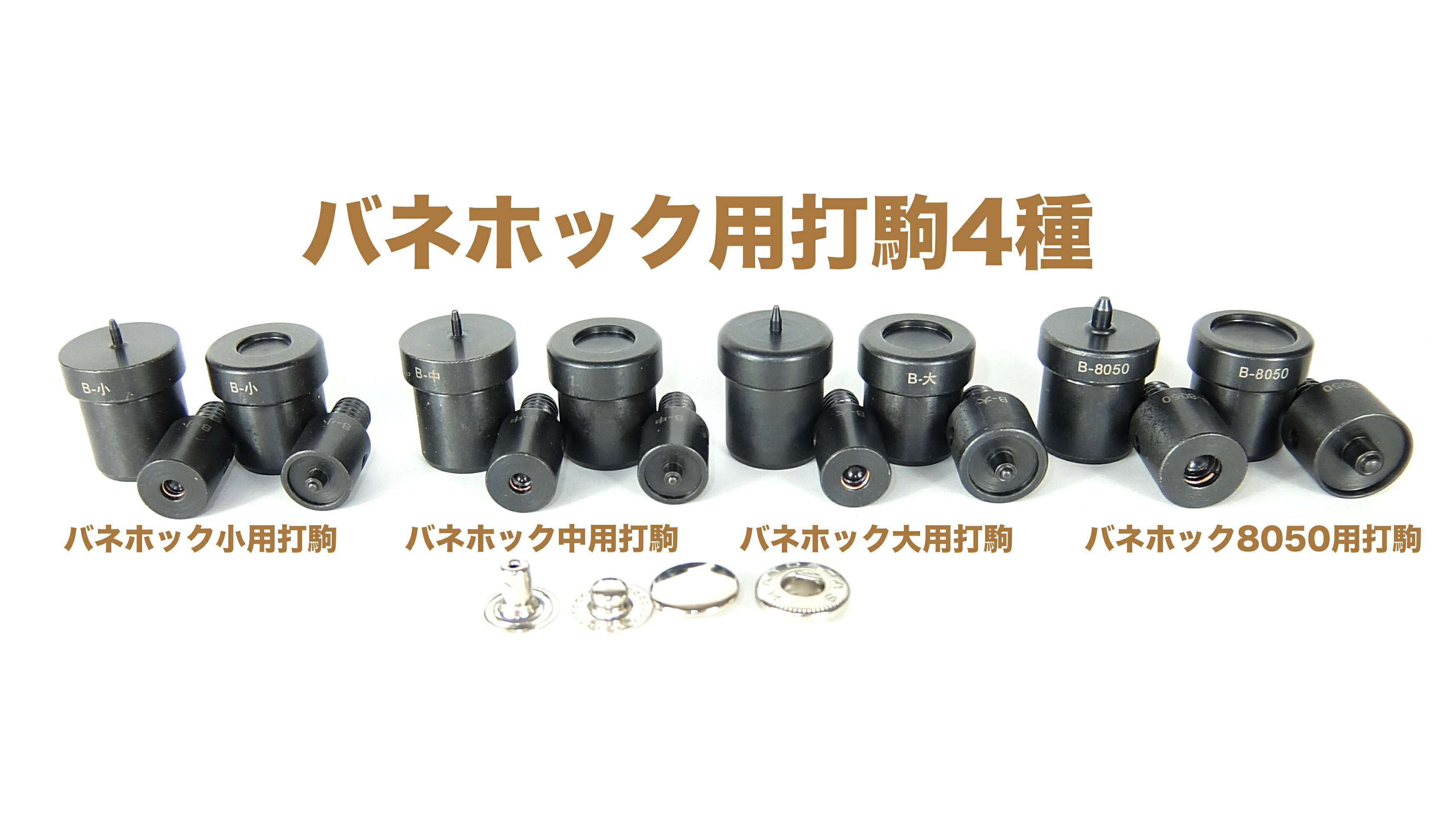 ハンドプレス用の打駒になります。 こちらのページは4種セット販売となります。 ステンレス製のため、錆びにくく、丈夫で長持ち。 打具よりも失敗なく安心・確実、作業音も小さいので夜中でも心配なくホック打ちができます。 国内規格のため、ハシハト(HASIHATO)ホック、協進エル、クラフト社、東急ハンズのホックに対応しています。 各種サイズのセット販売も行っていますので複数種類ご希望の場合はそちらもご検討ください。 各種サイズの個別販売、カシメコマ等も含めた12種セット販売も行っていますのでそちらもご検討ください。 ハンドプレス機用打ち駒13種セットはこちら↓