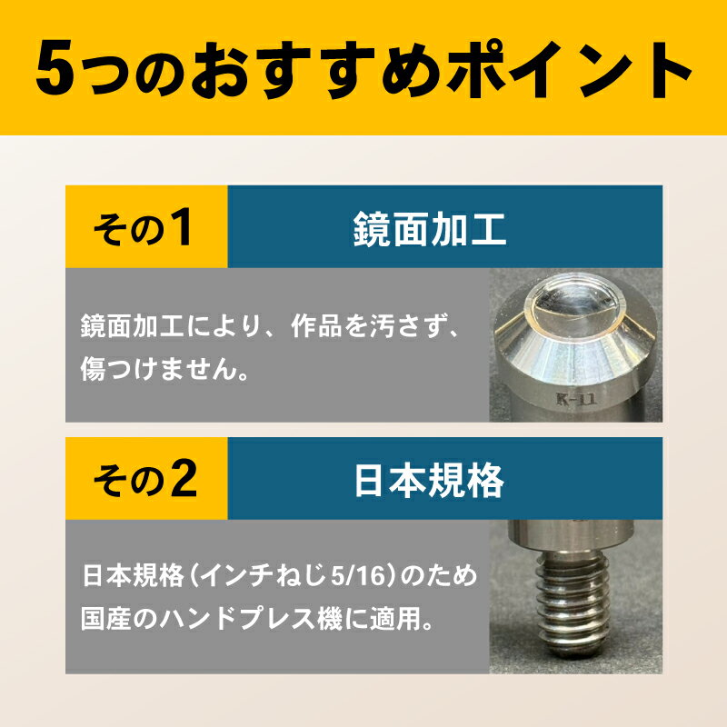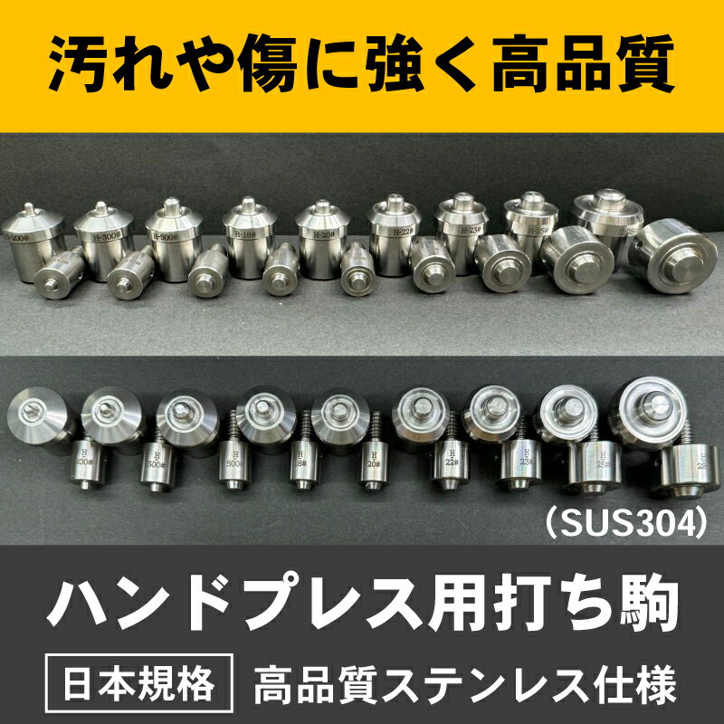 国産SUS304ステンレス製ハトメ用打ちコマ。 国産ステンレス製のため、錆びしない、磁気ない。 鏡面に近い研磨作業を実施済、作品に汚れなし、金具に傷を付けません。 打具よりも失敗なく安心・確実、作業音も小さいので夜中でも心配なくホック打ちができます。 国内規格のため、協進エル、クラフト社、東急ハンズのハトメパーツに対応しています。 こちらの商品は駒のみとなり、ハンドプレス機は付きません。