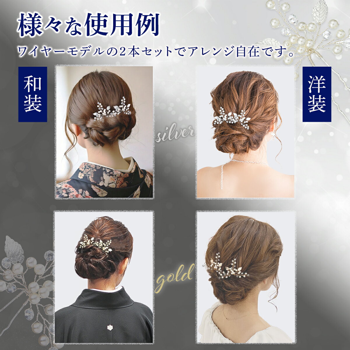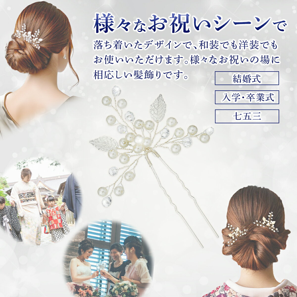 髪飾り パール 2点セット かんざし 和装 着物 簪 留袖 結婚式 ヘアアクセサリー ヘッドドレス ウェディング 成人式 入学式 卒業式 振袖 ドレス 華やか 洋装 真珠 ヘアコーム ヘアピン アレンジ 浴衣 Uピン リーフ 髪飾り パール 2点セット かんざし 和装 着物 簪 留袖 結婚式 ヘアアクセサリー ヘッドドレス ウェディング 美しいパールを贅沢にあしらったデザイン、2点セットでセットしたヘアに自在にアレンジできます。和装、洋装問わず合わせやすいデザインで派手過ぎずに幅広い年齢の方にマッチします。結婚式・入学式・卒業式・謝恩会・成人式・同窓会・入園式・発表会などさまざまなシーンでご使用頂けます。サイズ:約10.5×8.5cm(2点)材質:亜鉛合金 :フェイクパール :アクリル樹脂 2