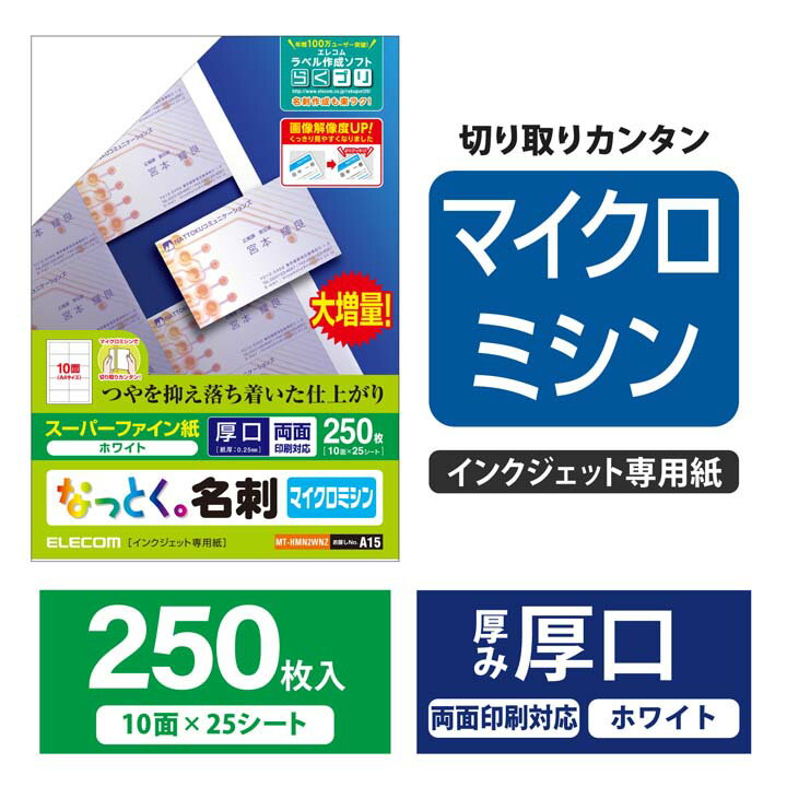 ■大増量、低価格でみんな納得:なっとく名刺。マイクロミシンカットが細かくエッジがきれいでさらにボリュームアップ増量で安くお得な名刺です。■印字面は両面塗工仕様で、デジカメ画像などの写真付き名刺の作成に適しています。 ■2〜3回用紙のミシン目を折り曲げると簡単に切り離し出来ます ■インクジェットプリンタ専用紙(ホワイト) ■坪量:210g/m2■紙厚(厚口)210g/m 0.245mm ■A4 10面付け25枚入り(両面) ■細かいマイクロミシンカットでエッジがきれい ■無料ダウンロード名刺テンプレートをご用意 ■インクジェット専用紙ですのでインクジェットプリンタ以外のプリンタ、コピー機などではご使用出来ません ■名刺サイズ(55×91mm)■枚数:250枚(10面付×25シート)■坪量:210g/m2■紙厚:0.25mmエレコムダイレクトショップ