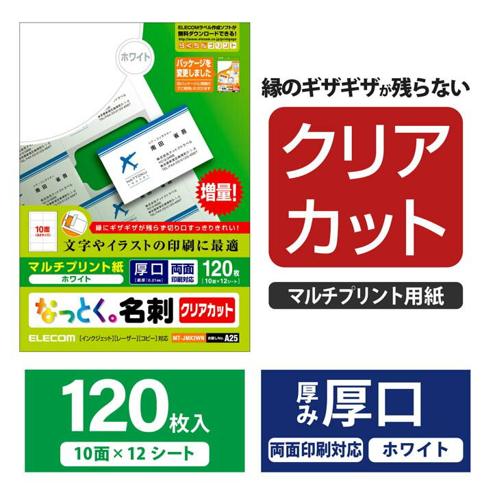 ■増量、低価格でみんな納得:なっとく名刺。クリアカットによりエッジの仕上がりがきれい。■印字面は両面印刷仕様です。 ■マルチプリント用紙(ホワイト) ■紙厚(厚手)186g/m2 0.205mm ■A4 10面付け12枚入り(両面) ■クリアカットによりエッジの仕上がりがきれい。 ■無料ダウンロード名刺テンプレートをご用意 ■インクジェットプリンタ-の他モノクロレ-ザ-プリンタ-、カラ-レ-ザ-プリンタ-でも利用できます。 ■写真画像の印刷には適していません ■お探しNO、A25■カラー:ホワイト■その他:クリアカット■用紙サイズ:A4■用紙タイプ:マルチプリント紙■紙厚:0.205mm■坪量:186g/m2■テストプリント用紙:1枚入■お探しNo.:A25■用紙枚数:12枚(10面付け)エレコムダイレクトショップ