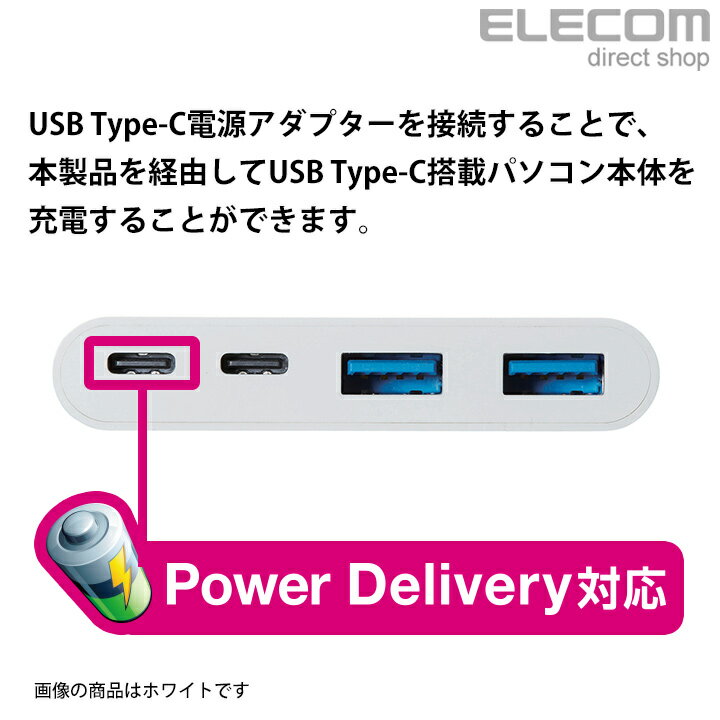 ■最新規格USB3.1 Gen2に対応し、充電しながら最高転送速度10Gbpsで高速データ転送。 USB Aポート2つとUSB Type-Cポート2つを搭載し、様々なUSB機器を使用できるPower Delivery対応のUSBハブ。■USB Aポート2つとUSB Type-Cポート2つを搭載し、様々なUSB機器を使用できるUSBハブです。 ■Type-Cコネクタを経由して最大100Wの大電力をデバイス/パソコン本体に供給するPower Deliveryに対応しています。 ■USB Type-C電源アダプターを接続することで、本製品を経由してUSB Type-C搭載パソコン本体を充電することができます。 ■最大10Gbps(理論値)の超高速データ転送を実現するUSB3.1 Gen2に対応しています。 ■USB Type-C搭載のMacBookに最適です。 ■USB Type-Cコネクタはオモテとウラがなく、向きを気にせず差し込み可能です。 ■セルフパワー・バスパワー共用タイプです。※セルフパワーで使用する際は、パソコン本体に付属している電源アダプターをご使用ください。 ■ケーブルは紛失の心配がない直付けタイプです。ケーブルの長さはノートパソコンでの使用に最適な約10.5cmです。 ■※パソコン充電用のUSB Type-C電源アダプターは付属していません。 ■※USB Type-Cコネクタを搭載するパソコンでのみ使用可能です。 ■※お使いの状況によってPower Deliveryの供給電力は変化します。■本製品はUSBポートを増設するための製品です。本製品を使用してスマートフォン・タブレットを充電することはおすすめできません。■インターフェイス:USB 3.1Gen2(USB3.1Gen1インターフェース接続時は、USB3.1Gen1互換で動作、USB3.0インターフェース接続時は、USB3.0互換で動作、USB2.0インターフェース接続時は、USB2.0互換で動作、USB1.1インターフェース接続時はUSB1.1互換で動作)■コネクタ形状:パソコン側(アップストリームポート):USB Type-C(オス)×1、USB機器側(ダウンストリームポート):USB A(メス)×2、USB Type-C(メス)×2■対応機種:Windows10、macOS High Sierra(10.13)■最大転送速度:USB3.1 Gen2スーパースピードプラス/10Gbps(理論値)、USB3.1 Gen1スーパースピード/5Gbps(理論値)、USB2.0ハイスピード/480Mbps(理論値)、USB1.1フルスピード12Mbps(理論値)■アップストリーム(パソコン側)ポート数:1■ダウンストリーム(周辺機器側)ポート数:4■USBケーブル方式:USB3.1 Gen2■USBケーブル長:約10.5cm(コネクタを除く)■電源方式:バスパワー/セルフパワー共用■供給可能電流:USB3.1Gen1接続時/セルフパワー時:PDポート以外の3ポート合計1.6A以内/バスパワー時:パソコンの給電力に準ずる■カラー:ブラック■外形寸法:約幅75.0×奥行42.0×高さ14.0mm(ケーブルを除く)■重量:約39.0g■動作環境:温度5〜40℃、湿度30〜80%(結露なきこと)■保証期間:6カ月■対応機種:Windows 11/10、macOS Ventura 13/macOS Monterey 12/macOS Big Sur 11/macOS Catalina 10.15 ※各OSの最新バージョンへのアップデートや、サービスパックのインストールが必要になる場合があります。エレコムダイレクトショップ最新規格USB3.1 Gen2に対応し、充電しながら最高転送速度10Gbpsで高速データ転送。 USB Aポート2つとUSB Type-Cポート2つを搭載し、様々なUSB機器を使用できるPower Delivery対応のUSBハブ。USB Aポート2つとUSB Type-Cポート2つを搭載したUSBハブUSB Aポート2つとUSB Type-Cポート2つを搭載し、様々なUSB機器を使用できるUSBハブです。U3HC-A423P5BK〈 ブラック 〉U3HC-A423P5WH〈 ホワイト 〉Power Delivery対応Type-Cコネクタを経由して最大100Wの大電力をデバイス/パソコン本体に供給するPower Deliveryに対応しています。USB Type-C電源アダプターを接続することで、本製品を経由してUSB Type-C搭載パソコン本体を充電することができます。USB3.1 Gen2に対応最大10Gbps(理論値)の超高速データ転送を実現するUSB3.1 Gen2に対応しています。セルフパワー・バスパワー共用タイプセルフパワー・バスパワー共用タイプです。※セルフパワーで使用する際は、パソコン本体に付属している電源アダプターをご使用ください。MacBookに最適USB Type-C搭載のMacBookに最適です。紛失の心配がない直付けタイプケーブルは紛失の心配がない直付けタイプです。ケーブルの長さはノートパソコンでの使用に最適な約10.5cmです。向きを気にせず差し込み可能USB Type-Cコネクタはオモテとウラがなく、向きを気にせず差し込み可能です。※パソコン充電用のUSB Type-C電源アダプターは付属していません。※USB Type-Cコネクタを搭載するパソコンでのみ使用可能です。※お使いの状況によってPower Deliveryの供給電力は変化します。