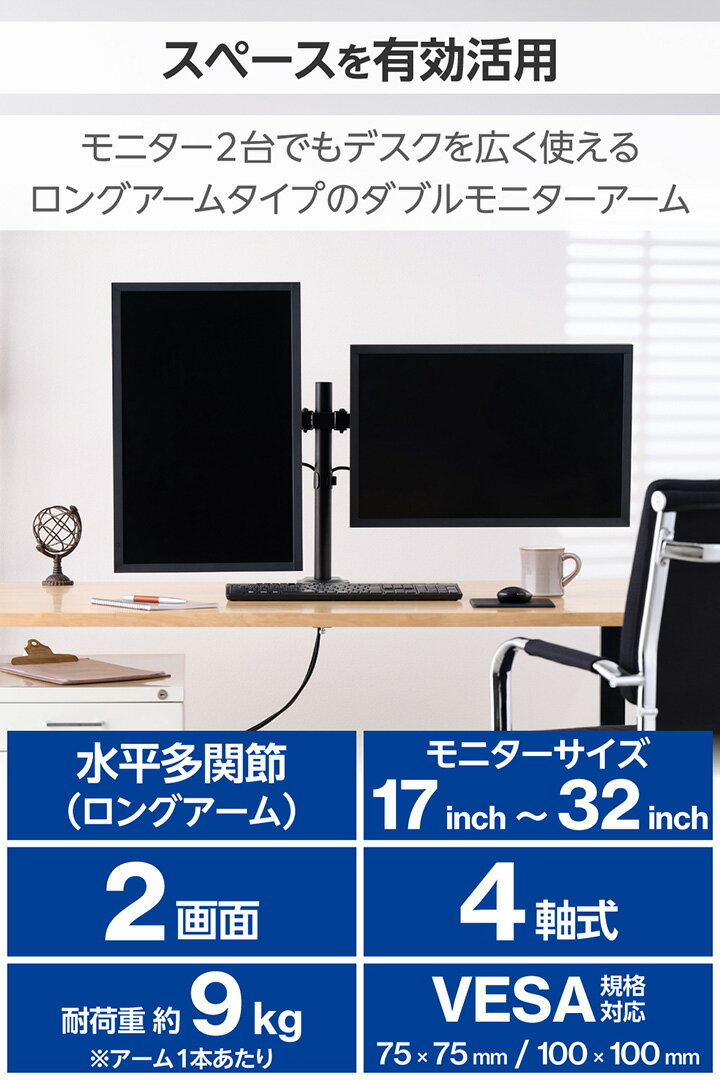 ■モニターの位置を自由に調節でき、デスクのスペースを有効活用!17〜32インチまでのモニターに対応する、ロングアームタイプのダブルモニターアーム。モニターからのケーブルをすっきりまとめることができる、ケーブルホルダー付きです。■17インチから32インチのモニターに対応する、モニター用アームです。 ■モニター下のスペースを有効活用して、デスクの上を広く使うことができます。 ■モニターの位置を自在に動かせて、お好みのポジションにセットできます。 ■モニターを2台設置できるダブルアームタイプです。 ■可動域の広い4軸可動のロングアームタイプです。 ■モニターからのケーブルをすっきりまとめることができる、ケーブルホルダー付きです。 ■VESA規格(75mm×75mm、100mm×100mm)に準拠したモニターに対応しています。 ■モニター背面にVESAマウントを取り付け、モニターアーム取付部に上から差し込みネジで固定してからご使用ください。 ■デスクの天板に挟んで固定するクランプ式と、天板に穴を開けてボルトを通して固定するグロメット式の2通りの取り付け方法が選べます。 ■モニターの使用角度が決まったら、接続部のネジをしっかりと締めて固定してください。 ■付属の六角レンチは、ポール用ケーブルホルダーに掛けて保管できます。 ■自社環境認定基準を1つ以上満たし、『THINK ECOLOGY』マークを表示した製品です。 ■環境保全に取り組み、製品の包装容器が紙・ダンボール・ポリ袋のみで構成されている製品です。■対応サイズ:17〜32インチ■耐荷重:約9.0kg■外形寸法:幅約860mm×奥行約115mm×高さ約540mm ※突起部、クランプノブを含まず■質量:約2.98kg■カラー:ブラック■セット内容:ポール×1、アーム×1、台座×1、クランプ用下パーツ×1、クランプ用上パーツ×1、グロメット用プレート×1、アーム先端パーツ×2、VESAプレート×2、アーム用ケーブルホルダー×4、ポール用ケーブルホルダー×1、VESAプレート固定ネジ×2■セット内容2:M8×20皿ネジ(×1)、M8×45ネジ(×2)、六角レンチ(5mm)×1、M4×12ネジ(×8)、M4×16ネジ(×8)、M5×12ネジ(×8)、M5×16ネジ(×8)、D5ワッシャー(×8)、スペーサー×8、取扱説明書×1■材質:スチール、ABS■取り付け画面数:2画面■固定方式:クランプ式/グロメット式■軸数:4軸■ガススプリング:-■対応規格:VESA規格(75mm×75mm、100mm×100mm)■可動範囲:パン:左90度/右90度、ローテーション:360度、チルト:上45度/下45度■取り付け可能天板厚:クランプ:10〜80mm、グロメット:10〜40mmエレコムダイレクトショップ