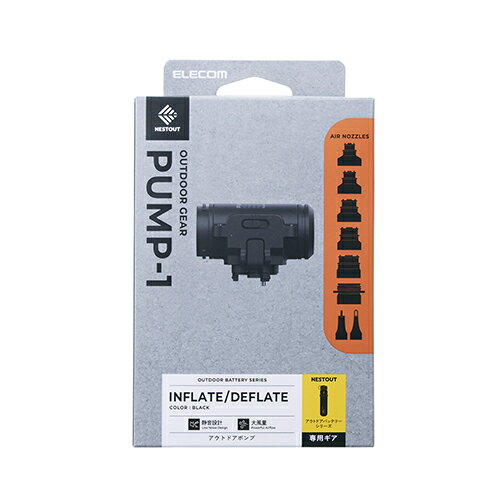 ■アウトドアシーンにおけるエアマットの展開・収納などで活躍する、エアポンプです。コンパクトながら大風量と静音性を両立し、300種類以上のマットに対応するノズルセットを付属。NESTOUT アウトドアバッテリーに取り付けて使う専用ギアです。■アウトドアに特化したブランド“NESTOUT(ネストアウト)”のアウトドアバッテリーシリーズ。 ■NESTOUTアウトドアバッテリーに取り付けて使える、専用のエアポンプです。 ■野外でのエアマットの設営など、送風が必要な場面で活躍。ノズルを付け替えてエアマット内の空気を吸い出すことができるため、収納・撤収もスムーズに行えます。 ■エアマットの設営時、湿気を含んだ呼気を吹き込むと内部にカビが発生する可能性があります。本製品の送風により、衛生的にエアマットを使えて、時間と体力も有効活用できます。 ■専用設計のブラシレスモーターにより、高い静音性を確保。静かな自然の中でも周囲の迷惑になりにくく、安心して使えます。 ■ブラシレスモーターと新開発のアルミインペラにより、大風量と高圧力を両立。大型のエアマットもすばやく展開・収納できます。 ■シングルサイズのエアマットを約30秒、シングルサイズのインフレーターマットを約1分で展開できます。 ■※シングルサイズのエアマット:195cm×59cm×6.5cm、シングルサイズのインフレーターマット:190cm×70cm×8cmを想定。かかる時間はあくまで目安です。エアマットのサイズや素材、使用時の環境により時間は変動します。 ■エアマット用のノズルを8種類付属しています。国内外で販売されている300種類以上のエアマットを調査し、幅広い商品にフィットする形状に仕上げました。送風時にバルブを手で押さえる必要はなく、ハンズフリーで設営できます。 ■ノズルはナンバリングされているため分かりやすく、スタッキングできるためコンパクトに持ち運ぶことができます。 ■※全てのエアマットとの互換性を保証するものではありません。 ■出力は2段階で調節可能。シーンに合わせて風の強さを加減したい場合などに便利です。 ■電源はNESTOUT アウトドアバッテリーから供給できます。5000mAhのバッテリーとの接続で、約40〜80分の連続使用が可能です。 ※使用時間は環境により異なる ■※本製品にNESTOUT アウトドアバッテリーは付属しません。別途ご用意ください。 ■軽量・コンパクト設計のため、登山や荷物の多いキャンプ時も負担になりません。 ■エアポンプと付属品をまとめて収納できる専用袋付き。細かいパーツもなくさず保管できます。 ■自社環境認定基準を1つ以上満たし、『THINK ECOLOGY』マークを表示した製品です。 ■環境保全に取り組み、製品の包装容器におけるプラスチック重量を、社内基準製品より20%以上削減した製品です。■電源:ネストアウト アウトドアバッテリー(別売)■連続動作時間:約40〜80分 ※容量5000mAhのネストアウトアウトドアバッテリーを使用し、満充電から動作した際の目安です。動作時間は使用する風量設定に依存します。使用するバッテリーの劣化、周辺の温度環境などにより動作時間が短くなることがあります。■最大静圧:約3.0kPa ※ISO5801およびJIS B 8330に基づく試験方法で測定。■最大風量:約160L/min ※ISO5801およびJIS B 8330に基づく試験方法で測定。■風量調節:2段階(強/弱)■対応バルブ直径:回転タイプ:外径14〜26mm、開閉タイプ:内径13〜32mm、浮輪タイプ:内径6〜13mm ※対応直径の範囲内でも使用するエアーマット等のバルブ形状により使用できないことがあります。全ての機種での対応を保証するものではありません。■定格電圧:5V■消費電流:3A■外形寸法:ポンプ本体:幅約46mm×奥行約64mm×高さ約44mm ※バッテリーを含まず■質量:約84g ※バッテリーを含まず■カラー:ブラック■付属品:エアノズル8種、空気入れ補助パーツ2個、ネストアウト アウトドアバッテリー接続パーツ、収納袋、取扱説明書■保証期間:1年間エレコムダイレクトショップ