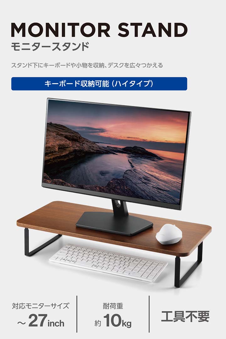 ■モニターの高さを上げ、目線を上げることでパソコン作業時の姿勢を改善するモニタースタンドです。スタンドの下にキーボードを置くなどスペースを有効活用できるので、デスクを広く使えます。■27インチまでのディスプレイ(パソコンモニター)に対応したディスプレイスタンドです。 ■約12cmの台でディスプレイ使用時の目線を上げられるため、パソコン作業の際の姿勢を改善します。 ■ディスプレイスタンドの下のスペースを有効活用してデスクの上を広く使うことができます。 ■パソコン不使用時にはディスプレイスタンドの下のスペースに横幅約50cmまでのフルキーボードを収納可能です。 ■工具不要の簡単組み立て仕様です。 ■脚部にはゴム脚がついているので、机上に設置しても滑りにくく安定してご使用いただけます。 ■自社環境認定基準を1つ以上満たし、『THINK ECOLOGY』マークを表示した製品です。 ■環境保全に取り組み、製品の包装容器が紙・ダンボール・ポリ袋のみで構成されている製品です。■対応サイズ:〜27インチディスプレイ■耐荷重:10kg■サイズ:幅約590mm×奥行約260mm×高さ約122mm■質量:約1.68kg■カラー:ウォールナット■材質:パーチクルボード、スチール■その他:ディスプレイスタンド下部内寸:幅約505mm×奥行約260mm×高さ約110mmエレコムダイレクトショップ