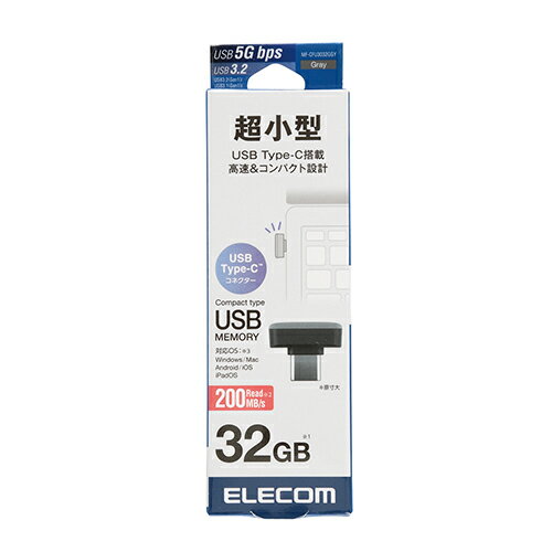 ■超小型サイズで、ノートパソコンに挿したままでも邪魔にならないUSB Type-C(TM)コネクター搭載のUSBメモリです。USB 5Gbps(USB 3.2(Gen1)/USB 3.1(Gen1)/USB3.0)対応で、最大200MB/sの高速読み込みを実現しています。容量32GBです。■超小型設計で、ノートパソコンに挿した際の本体の高さは約9mmと非常にコンパクト。本体の出っ張りが少ないため、挿したままでも邪魔にならず、持ち運びも簡単です。 ■USB Type-C(TM)コネクターを搭載し、接続した状態でも快適に使えるUSBメモリです。パソコン、スマートフォン、AIパソコン(AI PC)など、USB Type-Cポートを搭載したさまざまなデバイスに対応し、直接挿して動画や画像などのデータをすぐに移動・バックアップできます。 ■※本製品はUSB Type-Cコネクターのみ搭載しています。USB Type-Cポート搭載機器でご使用ください。 ■Windowsパソコン、Mac、スマートフォン、タブレットなど異なるデバイス間のデータ移動も本製品1個でできます。 ■USB 5Gbps(USB3.2(Gen1)/USB3.1(Gen1)/USB3.0)対応で、小型サイズながら、読み込み時の最大データ転送速度200MB/sを実現しています。 ■※最大転送速度は当社環境による実測値であり、すべての環境において保証するものではありません。 ■USB2.0への下位互換が可能で、USB2.0対応のパソコン・機器でもそのまま接続可能です。 ■Windowsのユーザー権限でも使用可能なので、企業での導入にもおすすめです。 ■保証期間を「1年間」としていますので、安心してご利用いただけます。 ■スマートフォンやタブレットなど、デバイスに標準搭載しているファイル管理アプリで、データの保存が可能です。 ■※当社ファイル管理アプリ「Extorage Link」には対応していません。 ■当社Webサイトからダウンロードすることで、パスワード自動認証機能付暗号化セキュリティソフト「PASS(Password Authentication Security System)×AES」あるいは「PASS(Password Authentication Security System)」を使用可能です。 ■「PASS(Password Authentication Security System)」使用時は、あらかじめ登録したパソコン(最大3台)では、USBメモリへのアクセスに必要なパスワード入力が不要で、未登録のパソコンに接続したときは、パスワード入力を要求し、盗難や紛失時のデータ漏えいを防止します。 ■「PASS(Password Authentication Security System)×AES」使用時に保存されたデータは、信頼性の高い強固な暗号化方式「AES256bit」で暗号化されるので、万一の紛失や盗難でも大切なデータの情報流出を防止します。 ■セキュリティソフトはMacにも対応し、WindowsパソコンとMacパソコン間でのデータのやり取りが可能です。 ■※セキュリティソフトはAndroidOS、iOS、iPadOSには対応していません。 ■※USB Type-C and USB-C are trademarks of USB Implementers Forum. ■自社環境認定基準を1つ以上満たし、『THINK ECOLOGY』マークを表示した製品です。 ■環境への負荷軽減のため、輸送効率を高める設計の外装箱を使用した製品です。 ■環境保全に取り組み、製品の包装容器が紙・ダンボール・ポリ袋のみで構成されている製品です。■対応OS(Windows):Windows 11/10■対応OS(macOS):macOS Sequoia 15/macOS Sonoma 14/macOS Ventura 13■対応OS(iOS):iOS18/17 ※Lightning端子搭載のiPhoneは非対応です。 ※全ての機器、OSバージョン、アプリケーションなどとの完全な互換性を保証するものではありません。当社が動作を保証する機器は対応表よりご確認ください。■対応OS(iPadOS):iPadOS 18/17/16 ※Lightning端子搭載のiPadは非対応です。 ※全ての機器、OSバージョン、アプリケーションなどとの完全な互換性を保証するものではありません。当社が動作を保証する機器は対応表よりご確認ください。■対応OS(Android):Android 15/14/13■インターフェース:USB 5Gbps(USB3.2(Gen1)/USB3.1(Gen1)/USB3.0)/USB2.0■コネクター形状:USB Type-C(TM)■容量:32GB■データ転送速度:読み込み最大200MB/s ※最大転送速度は当社環境による実測値であり、すべての環境において保証するものではありません。■セキュリティ機能:PASS(Password Authentication Security System) [パスワード自動認証機能付セキュリティソフト]あるいはPASS(Password Authentication Security System)×AES [パスワード自動認証機能付暗号化セキュリティソフト]■セキュリティソフトウェア対応機種:Windows 11/10が動作するWindowsパソコン、macOS Sonoma 14/macOS Ventura 13/macOS Monterey 12/macOS Big Sur 11が動作するMac■外形寸法:幅約20mm×奥行約14mm×高さ約9mm(コネクター含まず)■重量:約3g■電源:USBバスパワー■カラー:グレー■保証期間:1年間エレコムダイレクトショップ