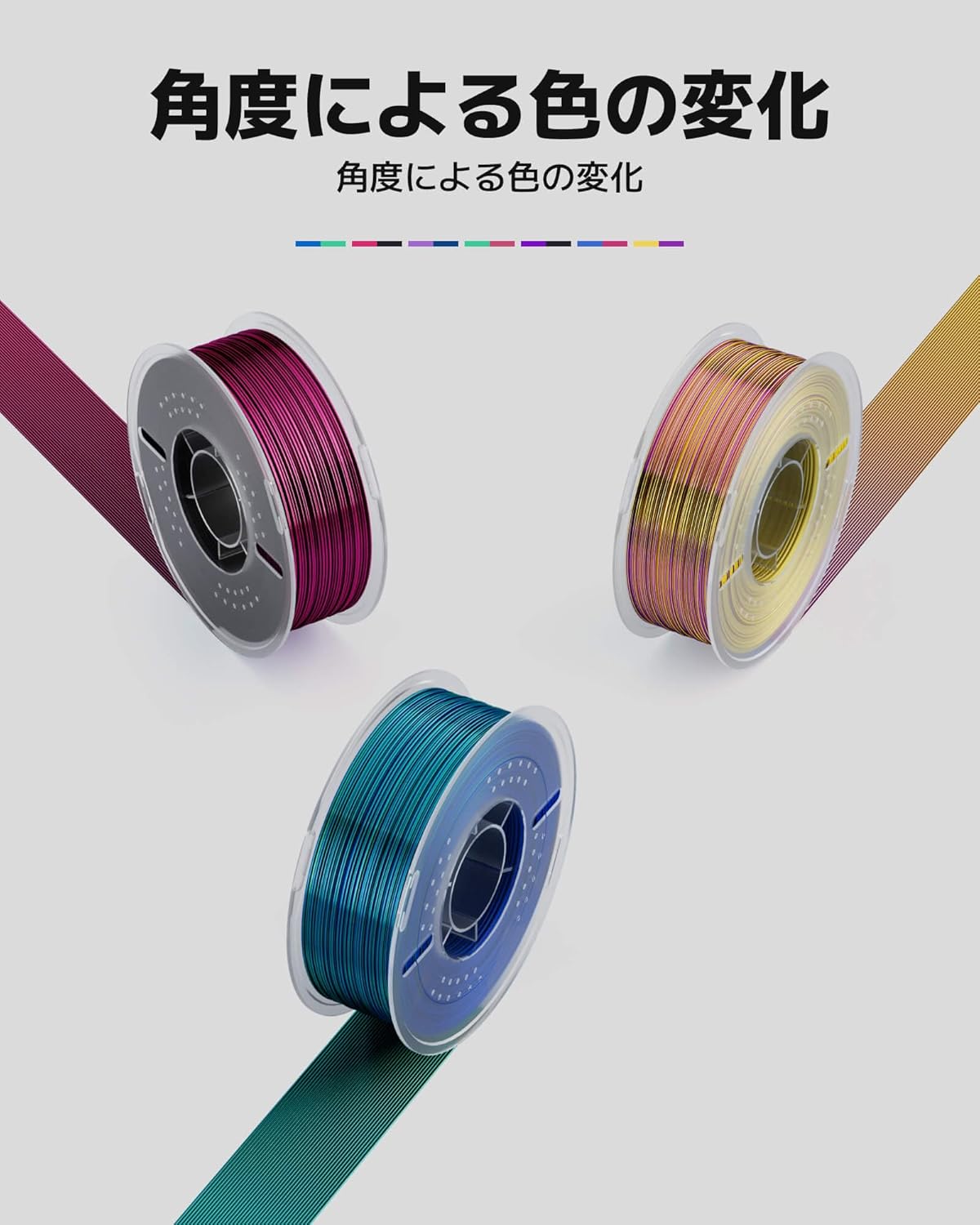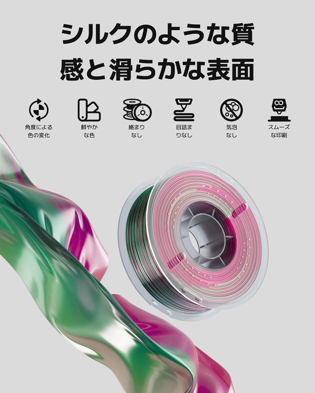 【見事なシルクカラー】 ELEGOOシルクPLAは、プリントに美しく光沢のある仕上がりを与えるように設計されています。 ユニークな光沢のある色が作品に高級感と目を引く外観を提供し、それらを目立たせます。 【高品質PLAフィラメント】 一般的に使用される熱可塑性材料である高品質PLAで作られており、溶融温度が低く使いやすく、反りや収縮が少なく、印刷中に無臭で、光沢のある表面仕上げが得られます。 【寸法精度と一貫性】 厳格な公差により、直径 1.75 mm の PLA フィラメントは +/- 0.02 mm の寸法精度でよりスムーズで安定した印刷を保証します。 ほとんどの 1.75mm FDM 3D プリンタとの汎用互換性があります。 【絡みにくく使いやすい】 完全な機械巻き取りと厳格な手作業による検査により、ラインがきちんと整っていて絡みが少ないことを確認し、スナップやラインブレイクの可能性を回避します。 スプール内径を大きく設計し、送り出しを容易にしました。 【目詰まりなし&気泡なし】 目詰まりがなく、優れた層結合と優れた流動性を備えて設計および製造されており、スムーズで安定した押出を実現します。 包装前に24時間完全に乾燥させ、袋内に入れて真空密封してフィラメントを湿気から保護し、目詰まりや泡立ちの問題がありません。