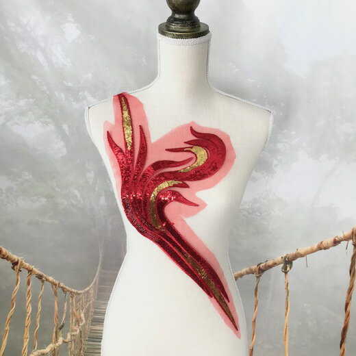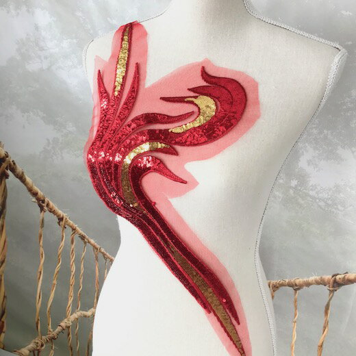 キラキラ アブストラクトのスパンコール付きの刺繍 チュールモチーフです。 キラキラしてて社交ダンス、バトントワリング、 レオタード、ベリーダンス、 フィギュアスケート、バレエ、ドレス、 ステージ衣装、ハンドメイド材料などに使用する と綺麗です。 サイズ:H58cm W21cm カラー:レッド・ゴールド