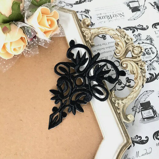 アイロン接着できるブラックの刺繍ワッペン モチーフになります。 お洋服と小物の製作はもちろん、バトントワリング、 レオタード、ドレス、ステージ衣装などに お使い頂けます。 使い方は色々です。 ※ アイロン接着or縫い付けも可能 サイズ:H10cm W7cm カラー:ブラック ※1枚 アイロン接着できます。 140℃〜160℃位で圧着してください。 熱が冷えるまで動かさないでください。