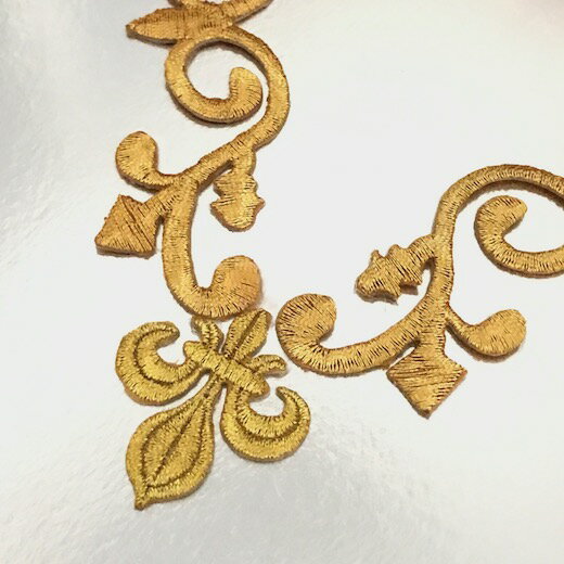 アイロン接着できるゴールドの刺繍ワッペン モチーフになります。 新体操、社交ダンス、バトントワリング、レオタード、 ベリーダンス、フィギュアスケート、バレエ衣装、ドレス、 ステージ衣装、手作り制作などにお使いいただけます。 アイロン接着or縫い付けも可能です。 サイズ:H13cm W14cm カラー:ゴールド ※当店のオリジナルデザインです。 アイロン接着できます。 140℃〜160℃位で圧着してください。 熱が冷えるまで動かさないでください。