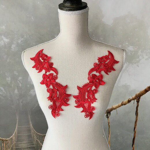 レッドの花模様のモチーフレースになります。 新体操、社交ダンス、バトントワリング、 レオタード、ベリーダンス、フィギュアスケート、 バレエ衣装、ドレス、服飾、ステージ衣装、 ハンドメイド材料などにお使いいただけます。 サイズ:H25cm W7cm カラー:レッド 左右セット
