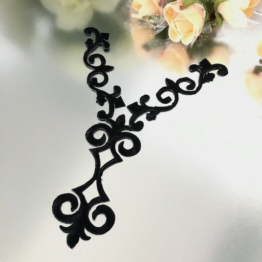 エレガントなブラックのネックライン形の ワッペンモチーフです。 新体操、バレエ衣装、レオタード、バトントワリング 、 ドレス、ステージ衣装などに飾り付けるモチーフです。 レオタードなどの好きな位置に、好きなデザインで 貼り付けて、スパンコールとラインストーンを加えて、 自由デザインができます。 手縫いとアイロンで貼り付けることもできます。 サイズ:H20cm W14cm カラー:ブラック ※当店のオリジナルデザインです。 アイロン接着できます。 140℃〜160℃位で圧着してください。 熱が冷えるまで動かさないでください。