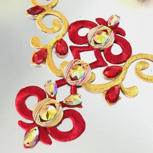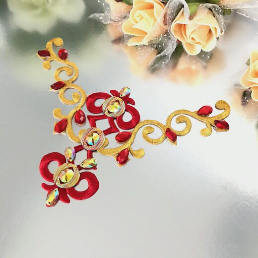 アイロン接着できるゴールドのストーン付き ネックライン形のワッペンモチーフになります。 新体操、社交ダンス、バトントワリング、 レオタード、ベリーダンス、フィギュアスケート、 バレエ衣装、ドレス、服飾、ステージ衣装、舞台衣装、 ハンドメイド材料などにお使いいただけます。 アイロン接着or縫い付けも可能です。 サイズ:H15cm W16cm カラー:ゴールド・レッド ※当店のオリジナルデザインです。 アイロン接着できます。 140℃〜160℃位で圧着してください。 熱が冷えるまで動かさないでください。