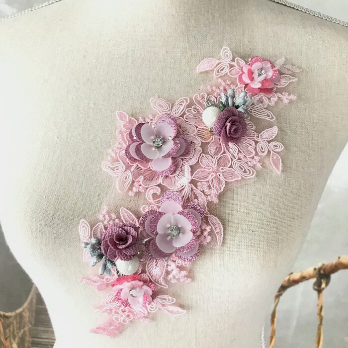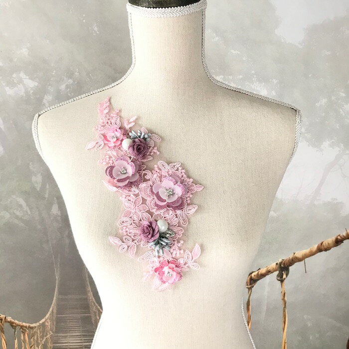 衣装モチーフ レオタードモチーフ チュールモチーフ 新体操 バトンモチーフ 花模様 装飾 ピンク パープル チュールモチーフレース 衣装装飾 服飾 ラインストーン付き パール付き