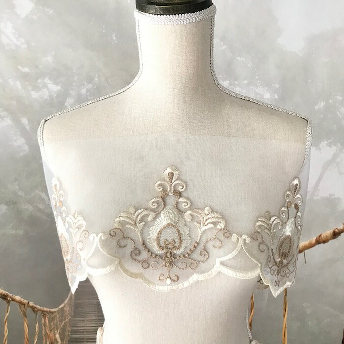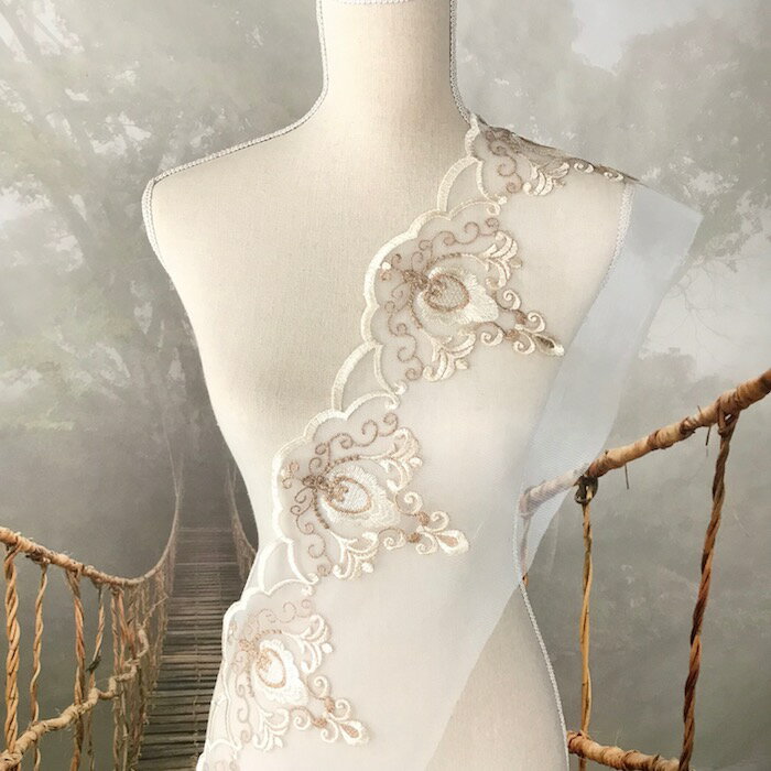 花模様のラメ刺繍入りチュールレースになります。 ステージ衣装、ダンスのコスチューム、コスプレ、 人形のドレス、ベリーダンス、レオタード、バレエ衣装、 バトンモチーフ、ハンドメイド材料などにおすすめです。 サイズ:W18cm カラー:ゴールデンブラウン・ベージュ 長さ:1ヤード(約90cm) チュール生地:ホワイト