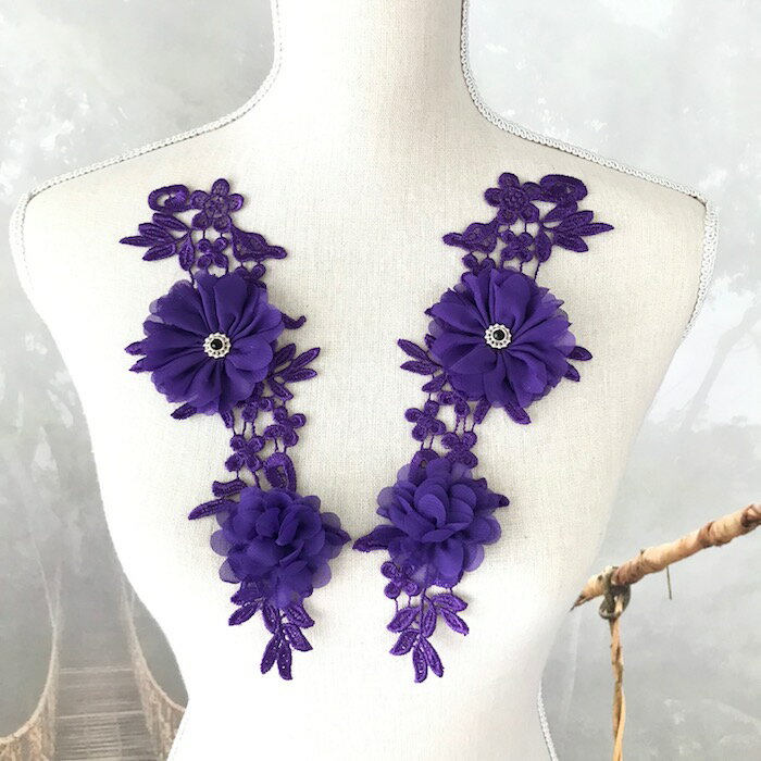 エレガントで立体的なお花と ラインストーン付きのレースモチーフセットです。 新体操、社交ダンス、バトントワリング、 レオタード、ベリーダンス、フィギュアスケート、 バレエ衣装、ドレス、服飾、ステージ衣装、舞台衣装、 ハンドメイド材料などにお使いいただけます。 カラー: パープル サイズ:H24cm W8cm 左右セット ※当店のオリジナルデザインです。