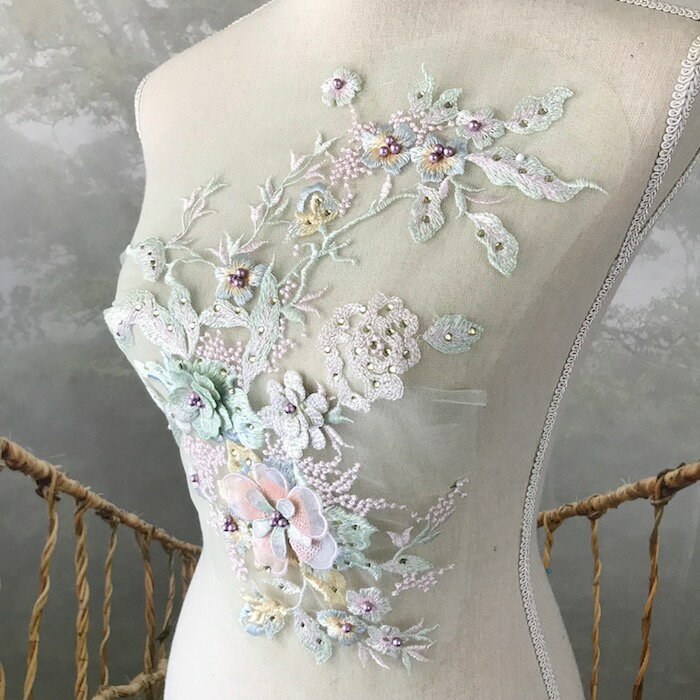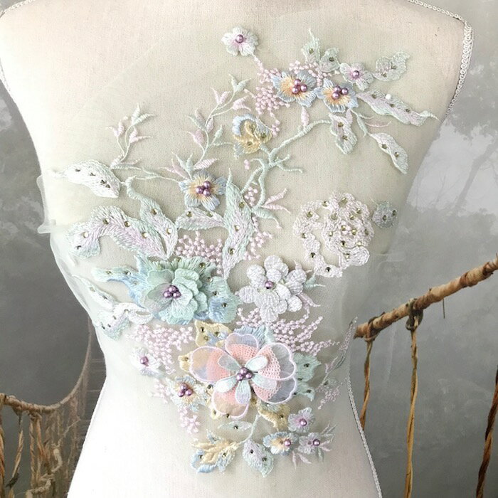 花柄のとてもエレガントなストーンとパールビーズ付きの 刺繍チュールモチーフです。 社交ダンス、バトントワリング、レオタード、 ベリーダンス、フィギュアスケート、バレエ衣装、ドレス、 ステージ衣装、ハンドメイド材料などに使用すると お洒落感がワンランクアップします。 サイズ:H36cm W28cm カラー:ピンク・グリーン系 (チュール部分:ライトグリーン) ............................................................ ビーズ類やストーン類がお花の中心からズレている場合がございます。 イベント、コンテスト、発表会、舞台などの衣装用として 遠くから見ることを前提にしておりますので ご理解をいただきました上でご注文をお願いいたします。 気になる方はご購入をご遠慮くださいますよう お願いいたします。