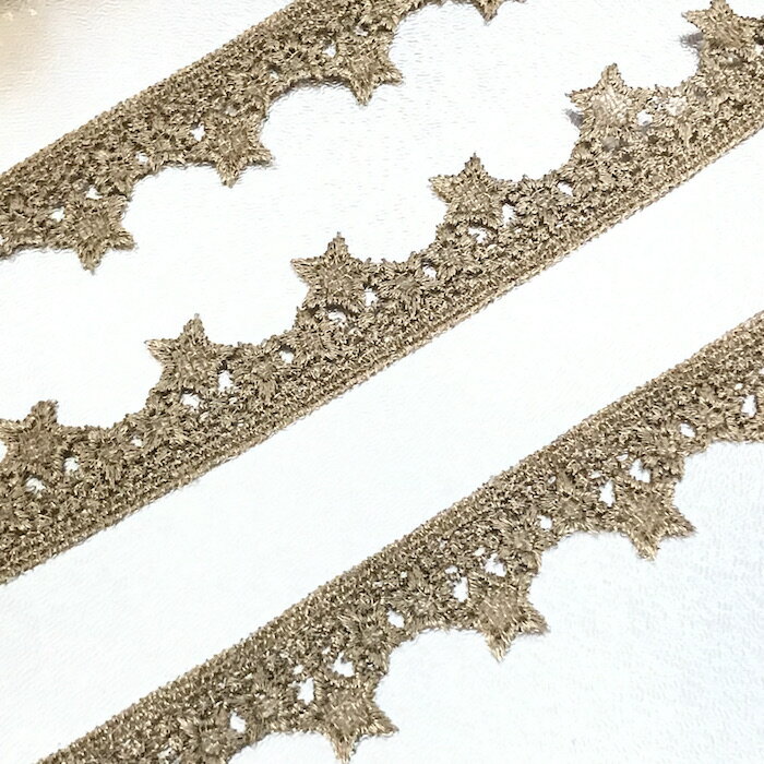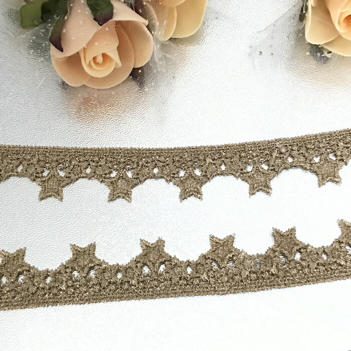 アンティークゴールドの星模様の装飾用レースになります。 コスチューム、新体操、社交ダンス、バトントワリング、 レオタード、ベリーダンス、バレエ衣装、ステージ衣装、 手作り制作など縫い付けるだけで個性的な 仕上がりになります。 サイズ:W2cm カラー:アンティークゴールド 長さ:1ヤード(約90cm)