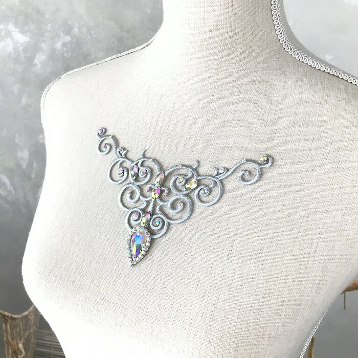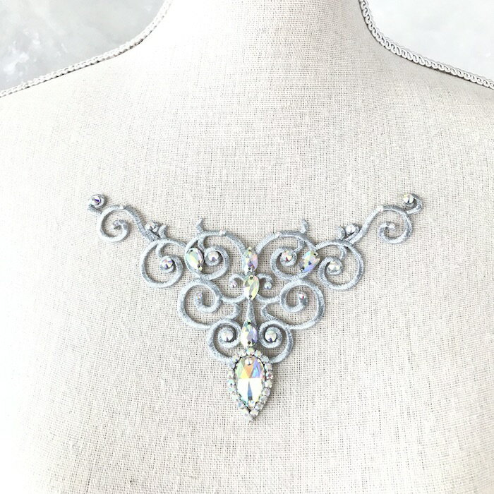 アイロン接着できるシルバーのストーン付き ネックライン形のワッペンモチーフになります。 新体操、社交ダンス、バトントワリング、 レオタード、ベリーダンス、フィギュアスケート、 バレエ衣装、ドレス、服飾、ステージ衣装、 ハンドメイド材料などにお使いいただけます。 アイロン接着or縫い付けも可能です。 サイズ:H15.5cm W11cm カラー:シルバー・ABオーロラ ※当店のオリジナルデザインです。 アイロン接着できます。 140℃〜160℃位で圧着してください。 熱が冷えるまで動かさないでください。