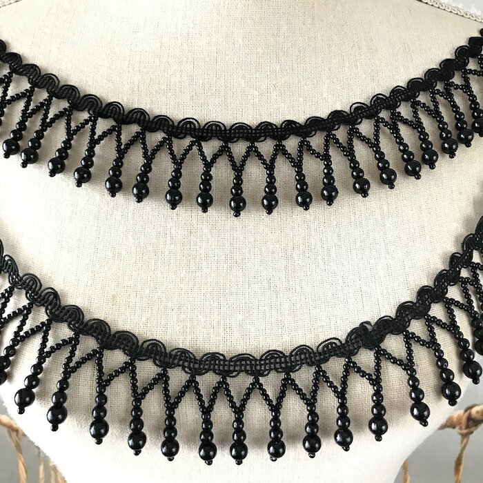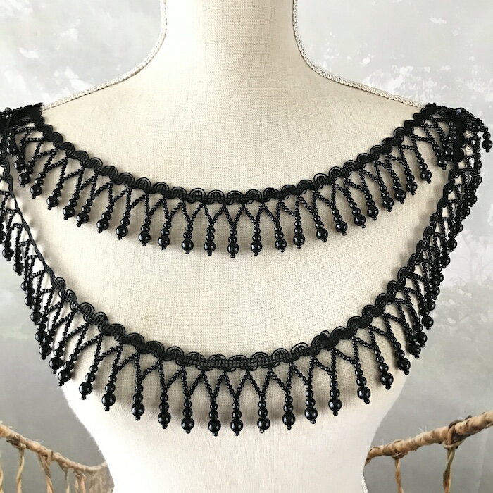 ビーズ付きブラックの装飾用フリンジレースブレードになります。 社交ダンス、ドレス、ステージ衣装、 舞台衣装、新体操、バトントワリング、レオタード、 演劇、ミュージカル、ベリーダンス、フィギュアスケート、 バレエ衣装、ウェディング、パーティーなど、 手作り制作など縫い付けるだけで個性的な仕上がりになります。 サイズ:W4.5cm カラー:ブラック 長さ:50cm …………………………. ビーズとレースは糸で繋がっておりますので、 カットした部分のビーズは縫い付けて仕上げてください。
