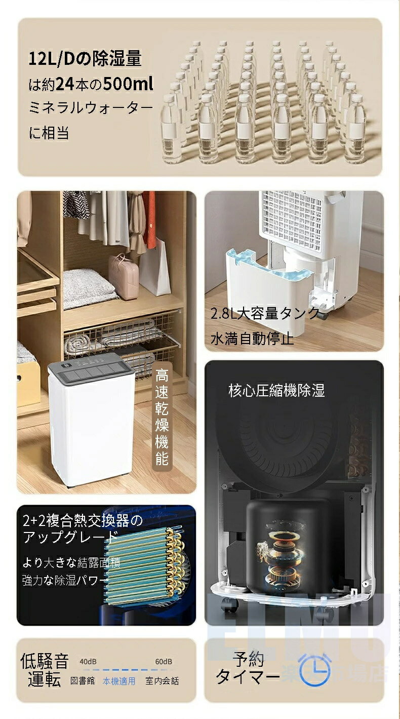 メーカー希望小売価格はメーカーサイトに基づいて掲載しています メーカー希望小売価格はメーカーサイトに基づいて掲載しています メーカー希望小売価格はメーカーサイトに基づいて掲載しています1. 電圧: 100-110V / 50-60Hz 2. 消費電力: 210W-230W(30℃、相対湿度80%) 3. 定格電流: 2.3-2.6A 4. 除湿能力: 12L/日(30℃、相対湿度80%) 冷媒種類: R134A 重量: 100g 5. タンク容量: 2.8L 6. 騒音値: 42dB以下 7. 風量: 180m?/h 8. 本体材質: ABS樹脂 9. 電源コード長さ: 1.8m 10. 製品サイズ: 275×195×450mm 11. 包装サイズ: 33×25×51cm 総重量: 9.5kg 正味重量: 9kg 12. 認証: PSE認証取得 - METI届出済み 13. 製品仕様: - 日本向け規格(日本国内仕様) - PSE認証済みプラグ付属 - 日本語取扱説明書 - 日本語表示パッケージ - 日本語操作パネル