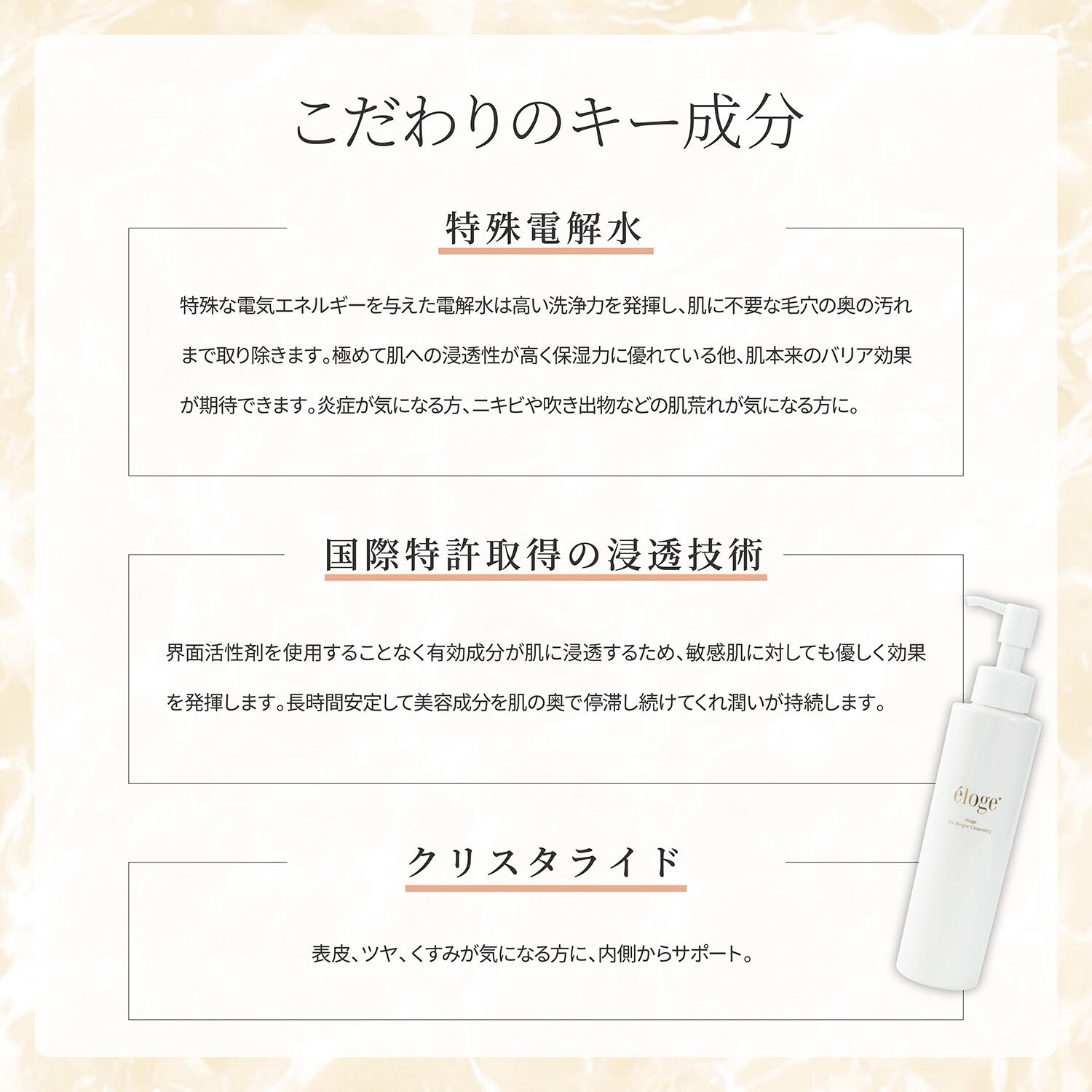éloge the Bright Cleansing エロージュ ザ ブライトクレンジング内容量 350ml [ツヤ][高保湿] 特徴 『素肌が喜ぶ、1日の終わりにご褒美を』 〜医療分野でも実用化されている特許技術を適応〜 [国際特許取得の浸透技術]皮膚組織と素早く馴染み、美容成分が持つ機能をスピーディーに発揮させる国際特許取得の浸透技術を採用しています。界面活性剤を使用することなく有効成分が肌に浸透するため、敏感肌に対しても優しく効果を発揮します。長時間安定して肌の奥で停滞し続けてくれることで効果をスピーディーに実感できるとともに潤いが持続します。 こんな方におすすめ クレンジング・洗顔を1本でしたい方 ツヤがほしい方 肌荒れ、ニキビ、吹き出物が気になる方 肌サイクル、保湿 今の製品に満足していない方 まつ毛エクステをされている方 キー成分 特殊電解水 特殊な電気エネルギーを与えた電解水は高い洗浄力を発揮し、肌に不要な毛穴の奥の汚れまで取り除きます。極めて肌への浸透性が高く保湿力に優れている他、殺菌効果を有しているため肌本来の力を高めます。細胞再生力が高く創傷治癒に用いられるため炎症を抑制しニキビや吹き出物などの肌荒れサポート クリスタライド くすみが気になる方に滑らかでツヤのある肌を目指します。 ヒト幹細胞培養液 最新のプロテオミクス解析により生まれた最先端バイオアクティブ成分。注目される「ヒト幹細胞培養液」に肌専門に開発された「ビタミン C 誘導体」と、コラーゲンリサイクル機能をサポートする「コラーゲンペプチド」を組み合わせたトリプル処方を採用しています。これに、タンパク質の中で肌細胞に最も働きかける6種を厳選した増強成分を配合することで、ヒト幹細胞培養液の働きを1000倍にすることを可能にし、 ハリ・ツヤのある輝く肌をサポート 《ヒト幹細胞培養液化粧品の魅力》ヒト幹細胞には自分と同じ能力を持つ幹細胞をコピーする能力があります。ヒト幹細胞培養液とは、上記の細胞を培養することで得られる液体のことで、これを化粧品 に配合(=ヒト幹細胞培養液化粧品)すること働きをサポートすることができます。これにより、シミ・シワ、ハリ・ツヤ、あらゆるお肌悩みをサポート。 ご使用方法 クレンジングの前に手を洗い、乾いた手に500円玉大くらい(1.2プッシュ)の量をとる 水気のない顔に額から鼻筋、両頬、顎に塗布する T ゾーンや頬は厚みをもたせて、摩擦しないように全体になじませる 30秒ほど放置して汚れを浮かせる 小鼻や毛穴の気になるところは指先で優しくなじませる ぬるま湯(30°C~35°C)ですすぎ洗い流す ※350mLご使用目安は、3ヶ月弱となります。 全成分 水、DPG、イソステアリン酸PEG-8グリセリル、ペンチレングリコール、トリイソステアリン酸、 PEG-20グリセリル、グリセリン、カプリロイルジペプチド-17、ヒト幹細胞順化培養液、合成ヒト遺伝子組換オリゴペプチド-1、合成ヒト遺伝子組換オリゴペプチド-2、合成ヒト遺伝子組換ポリペプチド-9、合成ヒト遺伝子組換ポリペプチド-10、合成ヒト遺伝子組換ポリペプチド-11、合成ヒト遺伝子組換ポリペプチド-60、ヒアルロン酸アスコルビルプロピル、パルミトイルジペプチド-18、パルミトイルテトラペプチド-10、アルガニアスピノサカルス培養エキス、ロドデンドロンフェルギネウム葉培養細胞エキス、リンゴ果実培養細胞エキス、グリチルリチン酸2K、水添レシチン、レシチン、酢酸トコフェロール、1,2-ヘキサンジオール、エチルヘキシルグリセリン、カプリリルグリコール、BG、トリ (カプリル酸/カプリン酸)グリセリル、パルミチン酸セチル、イソマルト、ステアリン酸ソルビタン、ポリソルベート80、セタノール、ミリスチルアルコール、ラウリルヒドロキシスルタイン、(アクリレーツ/アクリル酸アルキル(C10-30))クロスポリマー、 キサンタンガム、リン酸Na、水酸化K、 グリコール酸Na、グルタミン酸ジ酢酸4Na、ベルガモット果実油