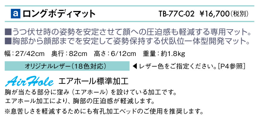 製品の仕様 サイズ 幅27/42×奥行82×高さ6/12cm 重量 約1.8kg 仕様 エアホール加工 配送について 大型商品(大型宅配便)について お届けは玄関の前まで、ビルやマンションの場合は共同玄関口までの配達となります。配達員は1名でお伺いをいたしますので、トラックからの荷下ろし、 搬入が困難な場合、お客様にお手伝いをお願いしております。 再配達について 路線便での配送となるため、不在時の持ち帰りや再配達の際に別途費用が発生します。ご不明な点はお問い合わせください。 搬入・設置組立について 時間指定や階段を利用しての搬入、設置組立をご希望の場合も別途費用が発生します。必要な場合は予めご相談ください。 個人宅への配送について ご注文時の備考欄に(施設名・屋号・予定名称)をご記入ください。お届け先が個人様宛の場合、別途送料が必要です。 北海道・沖縄・離島へのお届けについて 追加送料が発生します。法人様につきましても追加送料分のご負担が必要です。 サポート情報 ※メーカー希望小売価格はメーカーカタログに基づいて掲載しています。TB-77c-02 ロングボディマット うつ伏せ時の姿勢を安定させて顔への圧迫感も軽減する専用マット。胸部から顔部までを安定して姿勢保持する伏臥位一体型開発マット。エアホール標準加工。※息苦しさを軽減するためにも有孔加工ベッドのご使用を推奨します。 レザーカラーは18色のオリジナルレザーからお選びいただけます。 メディカル専用に開発された5つの特性を持つ高耐久ビニルレザーです。 高田ベッド製作所正規特約店のエンバシーで安心をプラス! 関連商品はこちら(孔加工の有無やサイズ違い、オプションなど) ロングボディマット用綿製カバー ご注文はこちらから