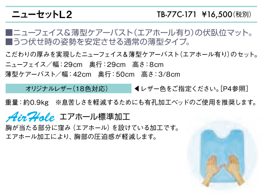 製品の仕様 ニューフェイス 幅29×奥行29×高さ8cm 薄型ケアーバスト 幅42×奥行50×高さ3/8cm 仕様 エアホール加工 配送について 大型商品(大型宅配便)について お届けは玄関の前まで、ビルやマンションの場合は共同玄関口までの配達となります。配達員は1名でお伺いをいたしますので、トラックからの荷下ろし、 搬入が困難な場合、お客様にお手伝いをお願いしております。 再配達について 路線便での配送となるため、不在時の持ち帰りや再配達の際に別途費用が発生します。ご不明な点はお問い合わせください。 搬入・設置組立について 時間指定や階段を利用しての搬入、設置組立をご希望の場合も別途費用が発生します。必要な場合は予めご相談ください。 個人宅への配送について ご注文時の備考欄に(施設名・屋号・予定名称)をご記入ください。お届け先が個人様宛の場合、別途送料が必要です。 北海道・沖縄・離島へのお届けについて 追加送料が発生します。法人様につきましても追加送料分のご負担が必要です。 サポート情報 ※メーカー希望小売価格はメーカーカタログに基づいて掲載しています。TB-77c-171 ニューセットL2 ニューフェイス&薄型ケアーバスト(エアホール有り)の伏臥位マット。うつ伏せ時の姿勢を安定させる通常の薄型タイプ。エアホール標準加工。※息苦しさを軽減するためにも有孔加工ベッドのご使用を推奨します。 レザーカラーは18色のオリジナルレザーからお選びいただけます。 メディカル専用に開発された5つの特性を持つ高耐久ビニルレザーです。 高田ベッド製作所正規特約店のエンバシーで安心をプラス! 関連商品はこちら(孔加工の有無やサイズ違い、オプションなど) ニューフェイス 薄型ケアーバスト ご注文はこちらから