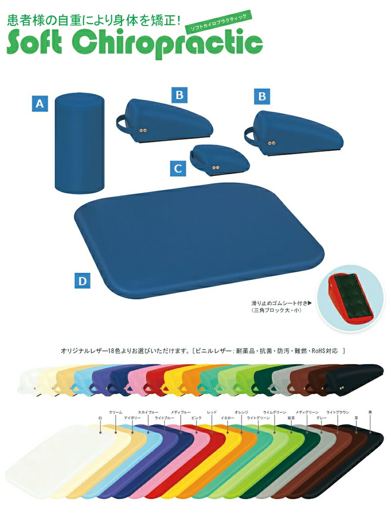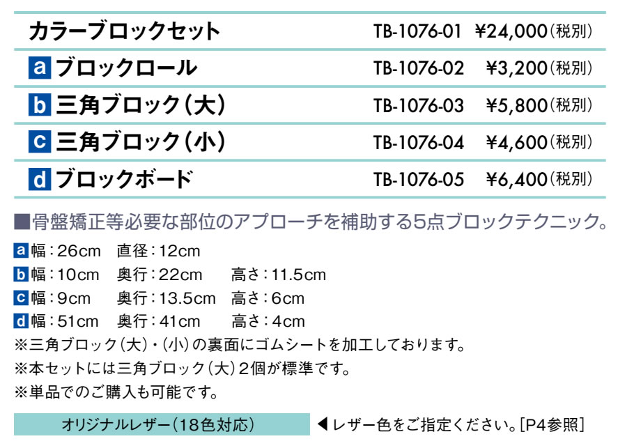 製品の仕様 A.ブロックロール 幅26×直径12cm B.三角ブロック(大) 幅10×奥行22×高さ11.5cm C.三角ブロック(小) 幅9×奥行13.5×高さ6cm D.ブロックボード 幅51×奥行41×高さ4cm 配送について 大型商品(大型宅配便)について お届けは玄関の前まで、ビルやマンションの場合は共同玄関口までの配達となります。配達員は1名でお伺いをいたしますので、トラックからの荷下ろし、 搬入が困難な場合、お客様にお手伝いをお願いしております。 再配達について 路線便での配送となるため、不在時の持ち帰りや再配達の際に別途費用が発生します。ご不明な点はお問い合わせください。 搬入・設置組立について 時間指定や階段を利用しての搬入、設置組立をご希望の場合も別途費用が発生します。必要な場合は予めご相談ください。 個人宅への配送について ご注文時の備考欄に(施設名・屋号・予定名称)をご記入ください。お届け先が個人様宛の場合、別途送料が必要です。 北海道・沖縄・離島へのお届けについて 追加送料が発生します。法人様につきましても追加送料分のご負担が必要です。 サポート情報 ※メーカー希望小売価格はメーカーカタログに基づいて掲載しています。TB-1076-01 カラーブロックセット 骨盤矯正等必要な部位のアプローチを補助する5点ブロックテクニック。※三角ブロック(大)・(小)の裏面にゴムシートを加工しております。※本セットには三角ブロック(大)2個が標準です。※単品でのご購入も可能です。 レザーカラーは18色のオリジナルレザーからお選びいただけます。 メディカル専用に開発された5つの特性を持つ高耐久ビニルレザーです。 高田ベッド製作所正規特約店のエンバシーで安心をプラス! 関連商品はこちら(孔加工の有無やサイズ違い、オプションなど) ブロックロール 三角ブロック(大) 三角ブロック(小) ブロックボード ご注文はこちらから