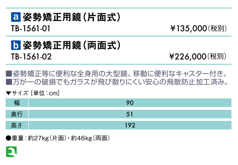 製品の仕様 サイズ 幅90×奥行51×高さ192cm 組立の有無 組立必要(スパナ付属) 重量 約27kg 配送について 大型商品(大型宅配便)について お届けは玄関の前まで、ビルやマンションの場合は共同玄関口までの配達となります。配達員は1名でお伺いをいたしますので、トラックからの荷下ろし、 搬入が困難な場合、お客様にお手伝いをお願いしております。 再配達について 路線便での配送となるため、不在時の持ち帰りや再配達の際に別途費用が発生します。ご不明な点はお問い合わせください。 搬入・設置組立について 時間指定や階段を利用しての搬入、設置組立をご希望の場合も別途費用が発生します。必要な場合は予めご相談ください。 個人宅への配送について ご注文時の備考欄に(施設名・屋号・予定名称)をご記入ください。お届け先が個人様宛の場合、別途送料が必要です。 北海道・沖縄・離島へのお届けについて 追加送料が発生します。法人様につきましても追加送料分のご負担が必要です。 サポート情報 ※メーカー希望小売価格はメーカーカタログに基づいて掲載しています。TB-1561-01 姿勢矯正用鏡(片面式) 姿勢矯正等に便利な全身用の大型鏡。移動に便利なキャスター付き。万が一の破損でもガラスが飛び散りにくい安心の飛散防止加工済み。 フレーム塗装に粉体塗装を採用! 高田ベッド製作所正規特約店のエンバシーで安心をプラス! ご注文はこちらから