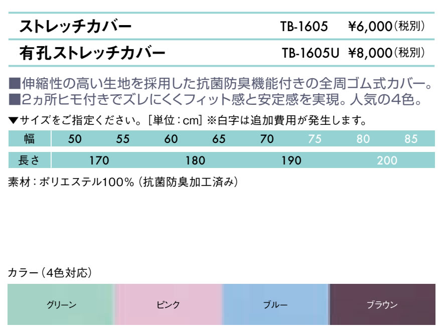 製品の仕様 幅 50 - 55- 60 - 65 - 70cm 奥行 170 - 180 - 190cm 仕様 ポリエステル100%(抗菌防臭加工済み) 配送について 大型商品(大型宅配便)について お届けは玄関の前まで、ビルやマンションの場合は共同玄関口までの配達となります。配達員は1名でお伺いをいたしますので、トラックからの荷下ろし、 搬入が困難な場合、お客様にお手伝いをお願いしております。 再配達について 路線便での配送となるため、不在時の持ち帰りや再配達の際に別途費用が発生します。ご不明な点はお問い合わせください。 搬入・設置組立について 時間指定や階段を利用しての搬入、設置組立をご希望の場合も別途費用が発生します。必要な場合は予めご相談ください。 個人宅への配送について ご注文時の備考欄に(施設名・屋号・予定名称)をご記入ください。お届け先が個人様宛の場合、別途送料が必要です。 北海道・沖縄・離島へのお届けについて 追加送料が発生します。法人様につきましても追加送料分のご負担が必要です。 サポート情報 ※メーカー希望小売価格はメーカーカタログに基づいて掲載しています。TB-1605 無孔ストレッチカバー 伸縮性の高い生地を採用した抗菌防臭機能付きの全周ゴム式カバー。2ヵ所ヒモ付きでズレにくくフィット感と安定感を実現。人気の4色。ベッドカバーのみの販売です。こちらの商品は無孔タイプです。 選べるカラー・抗菌防臭加工済みポリエステル100% 高田ベッド製作所正規特約店のエンバシーで安心をプラス! 関連商品はこちら(孔加工の有無やサイズ違い、オプションなど) 有孔ストレッチカバー ご注文はこちらから